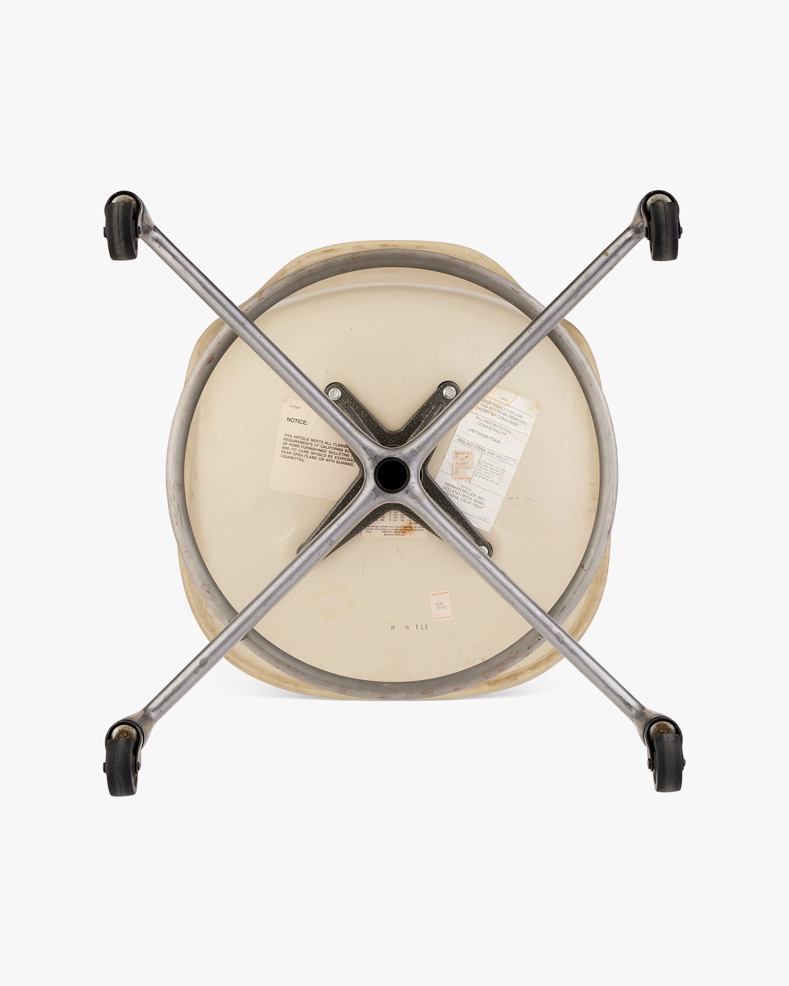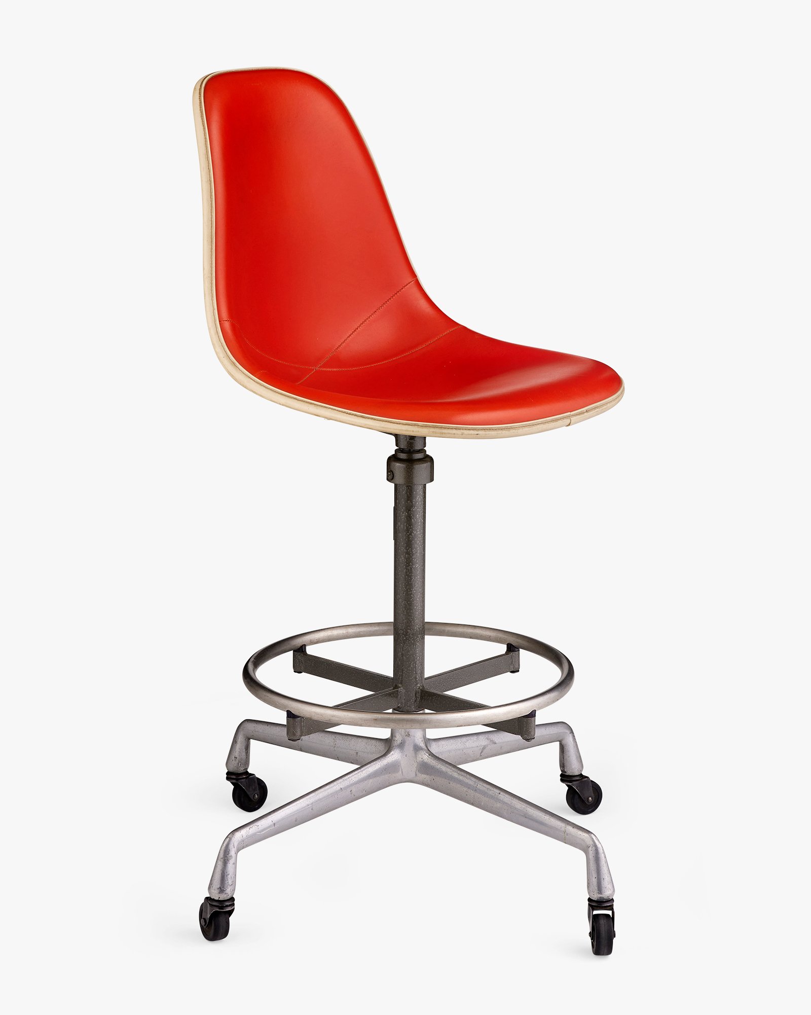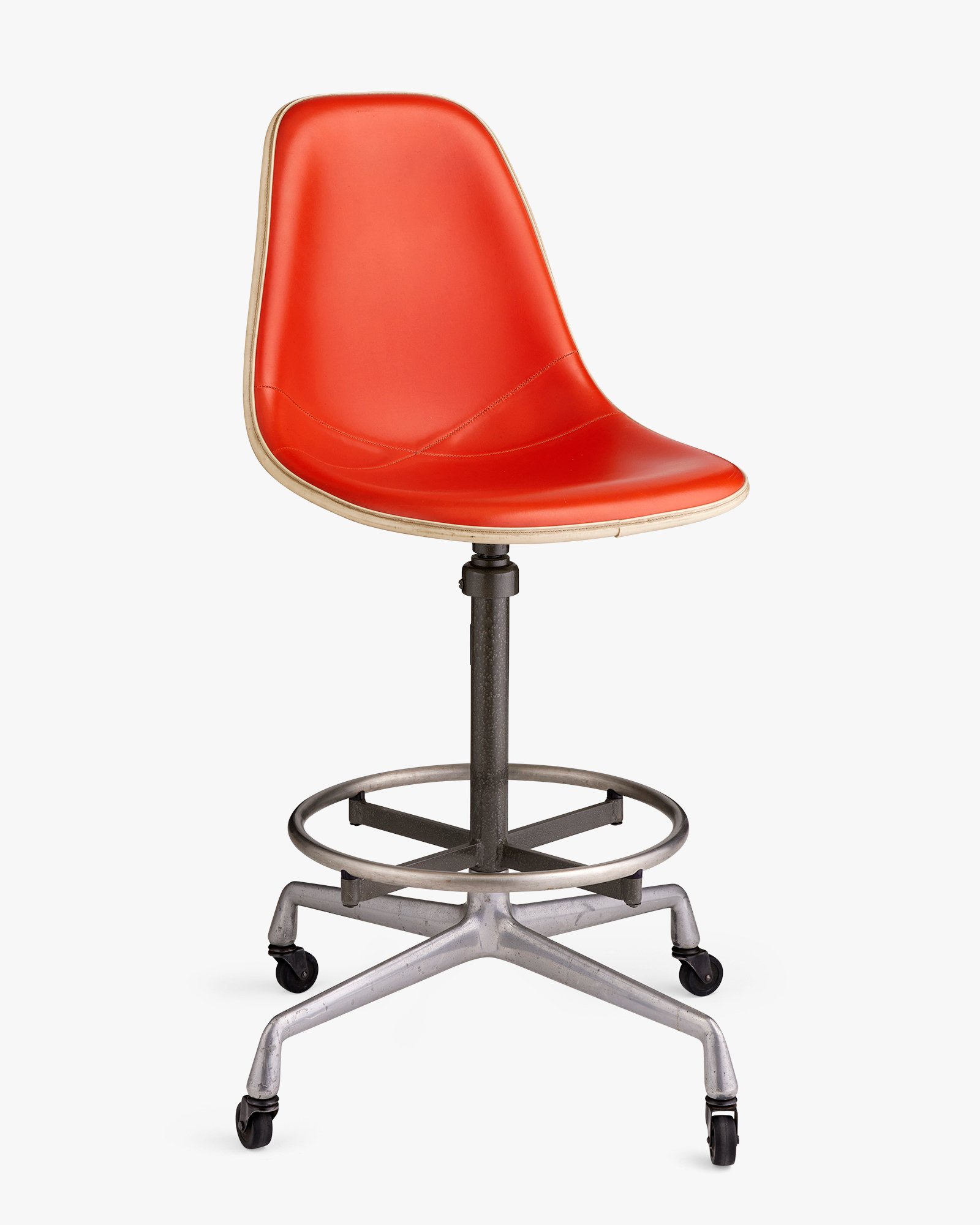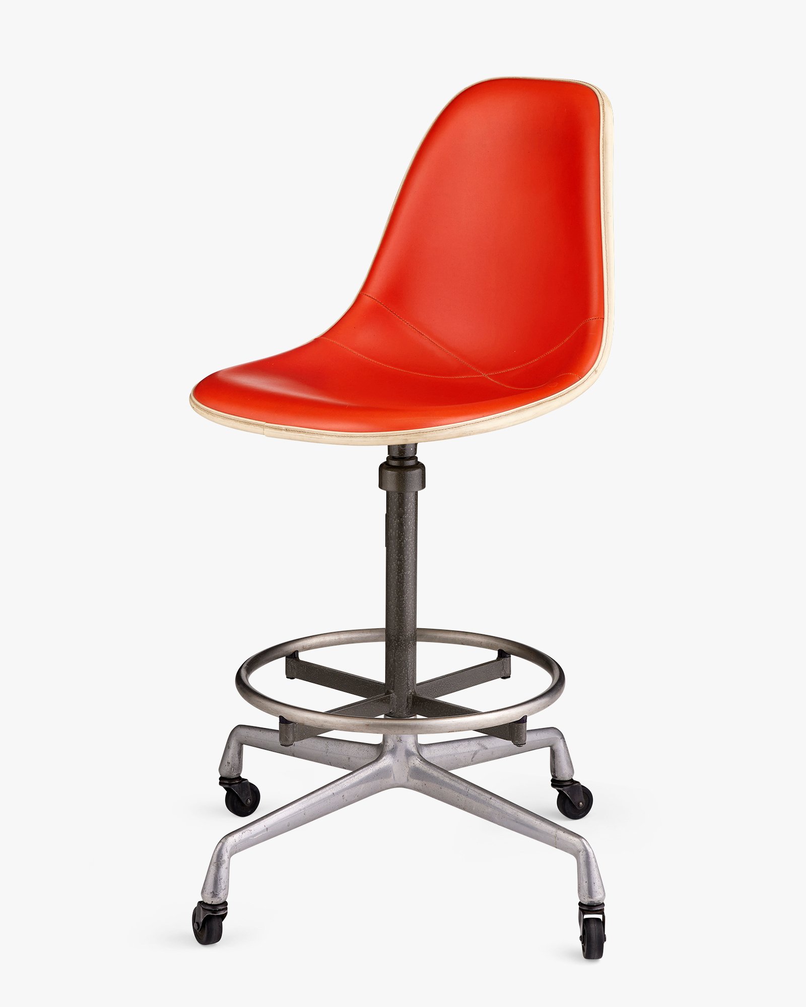 The second-generation Drafting Chair, introduced in 1969, retains many of the design choices of the first, with one exception—casters. The first version of the Drafting Chair had elegant tubular legs that were very strong but too narrow to fit with casters. Since these chairs were intended for heavy use in an office setting, they needed to be sturdy and flexible. The updated version retains the steel foot ring, and the new base can accommodate either casters or glides.