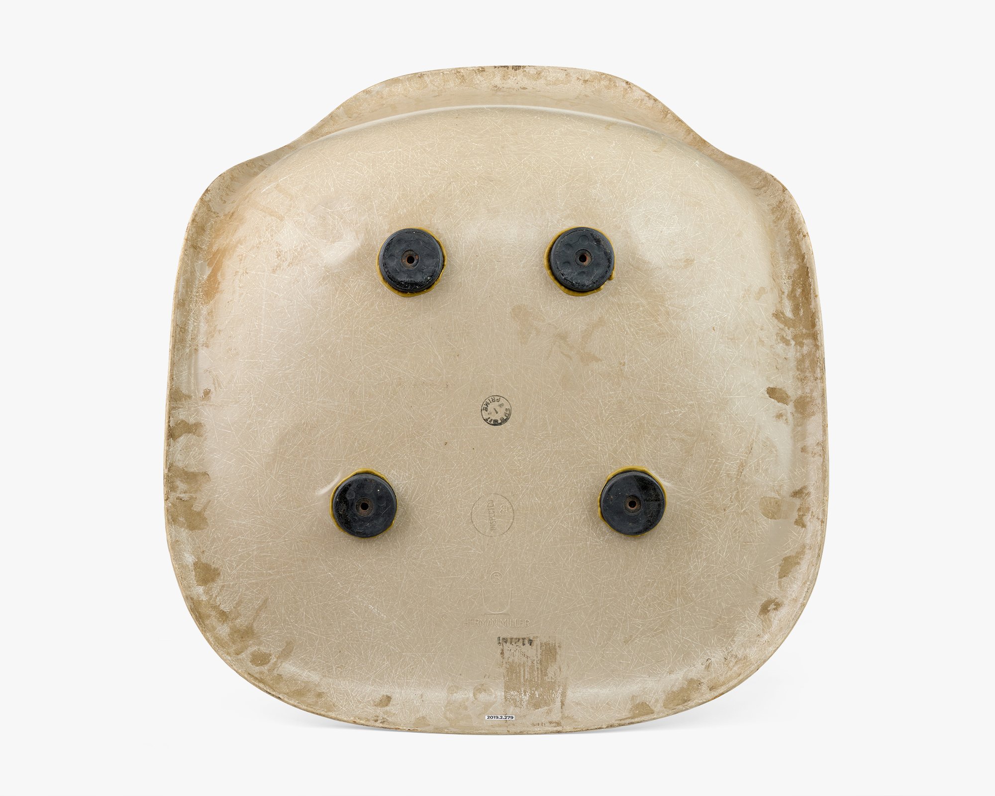 A circular, black ink stamp (“Summit Prime”), a circular, taupe ink stamp (“INSPECTED”), an embossed backward “B” inside a taupe circle, an embossed Summit logo (“S” inside a circle), an embossed Herman Miller logo and word mark, and “412161” printed in black ink are on the underside of the shell.