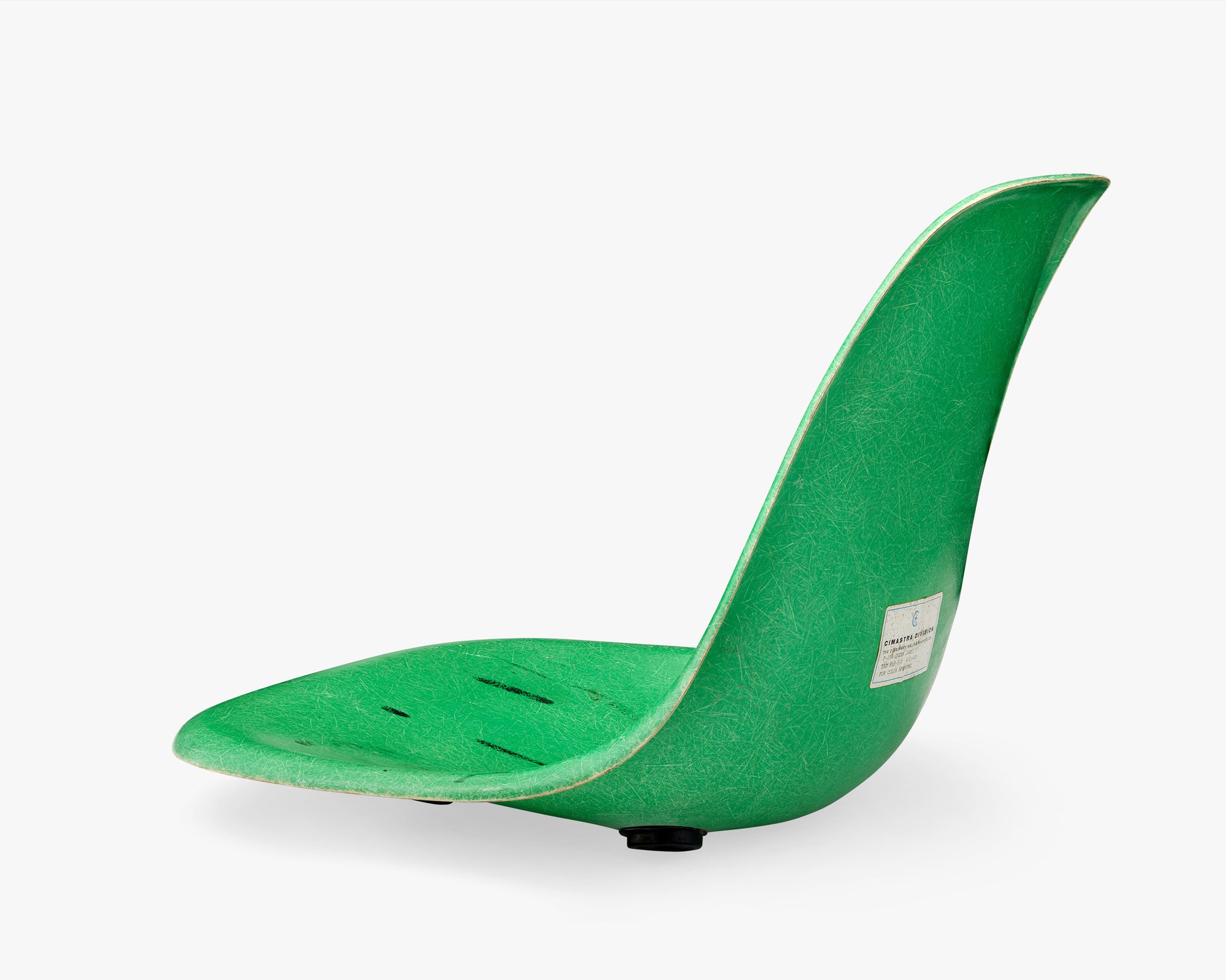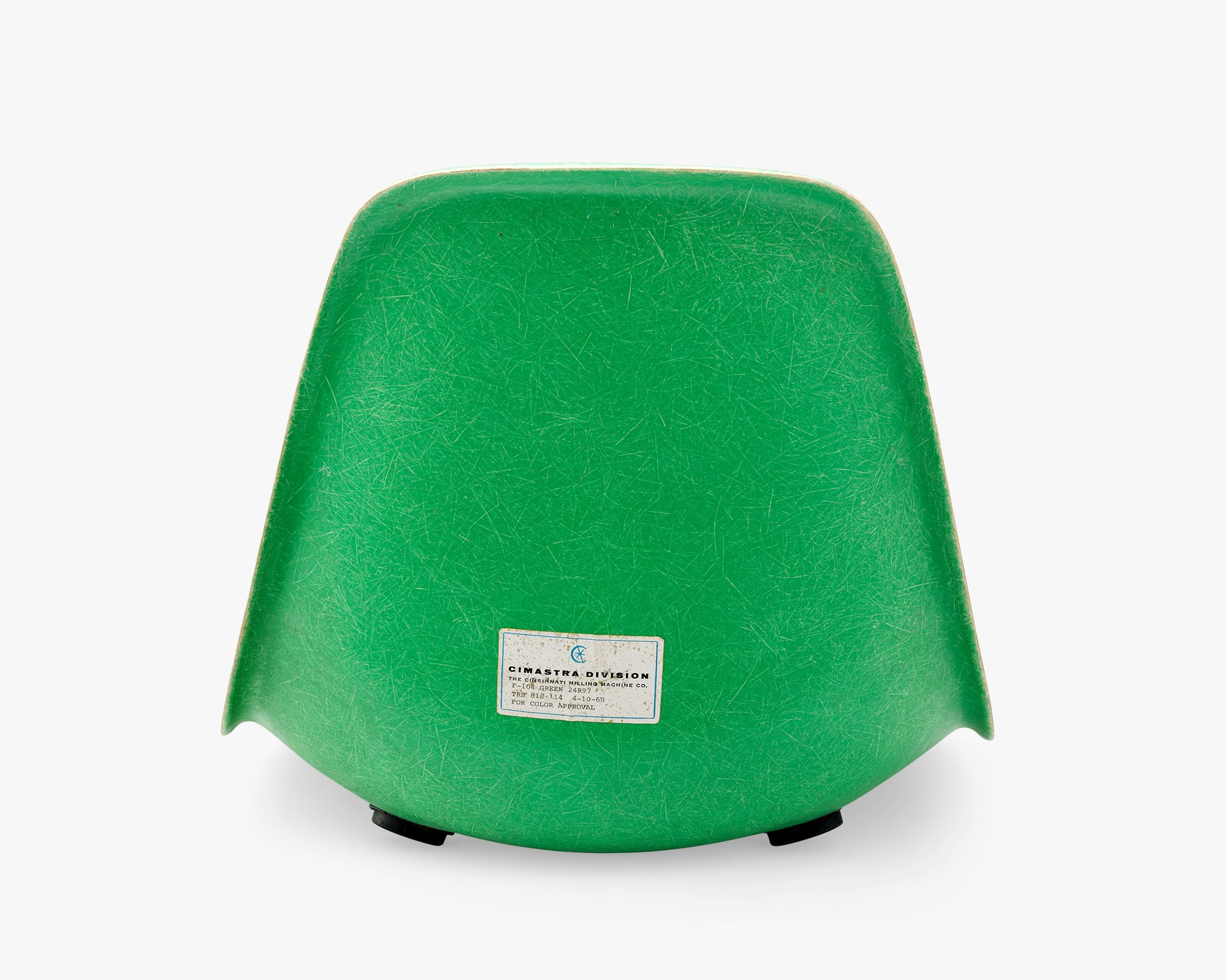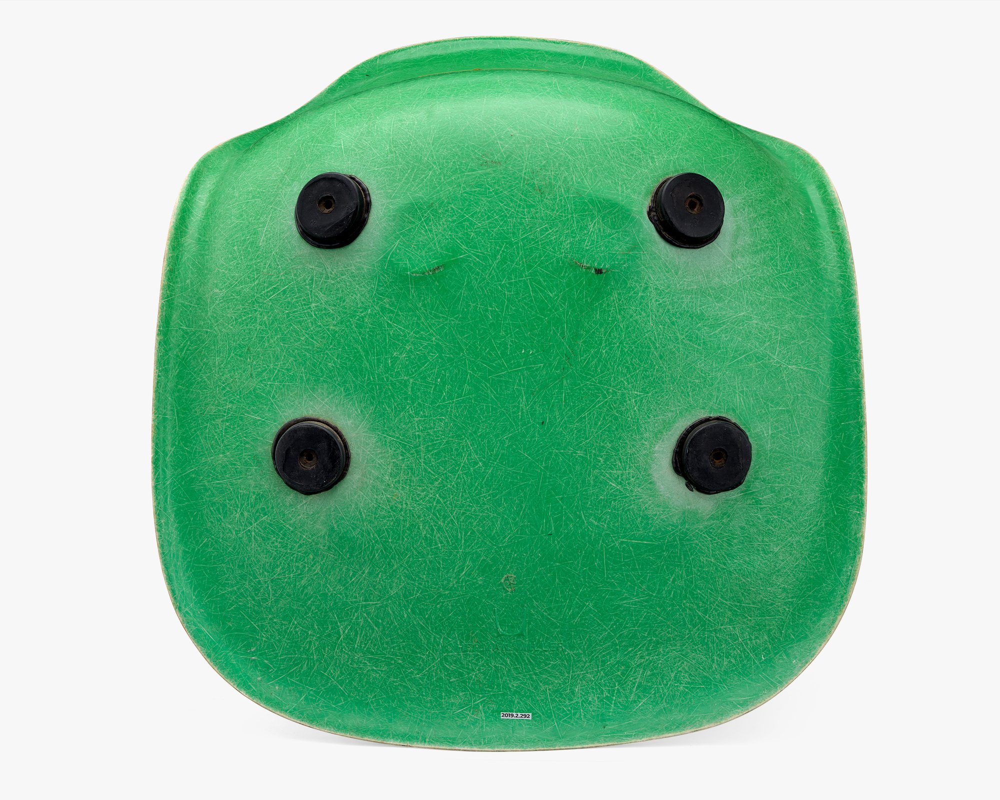 An embossed Cincinnati Milling Machine Company logo (“C” with a six-pointed star) and an embossed Herman Miller logo and word mark are on the underside of the shell. A white, rectangular Cimastra sticker with a blue border and “F-104 GREEN 24R97, TRB 818-114 4-10-68, FOR COLOR APPROVAL” is on the seat reverse.