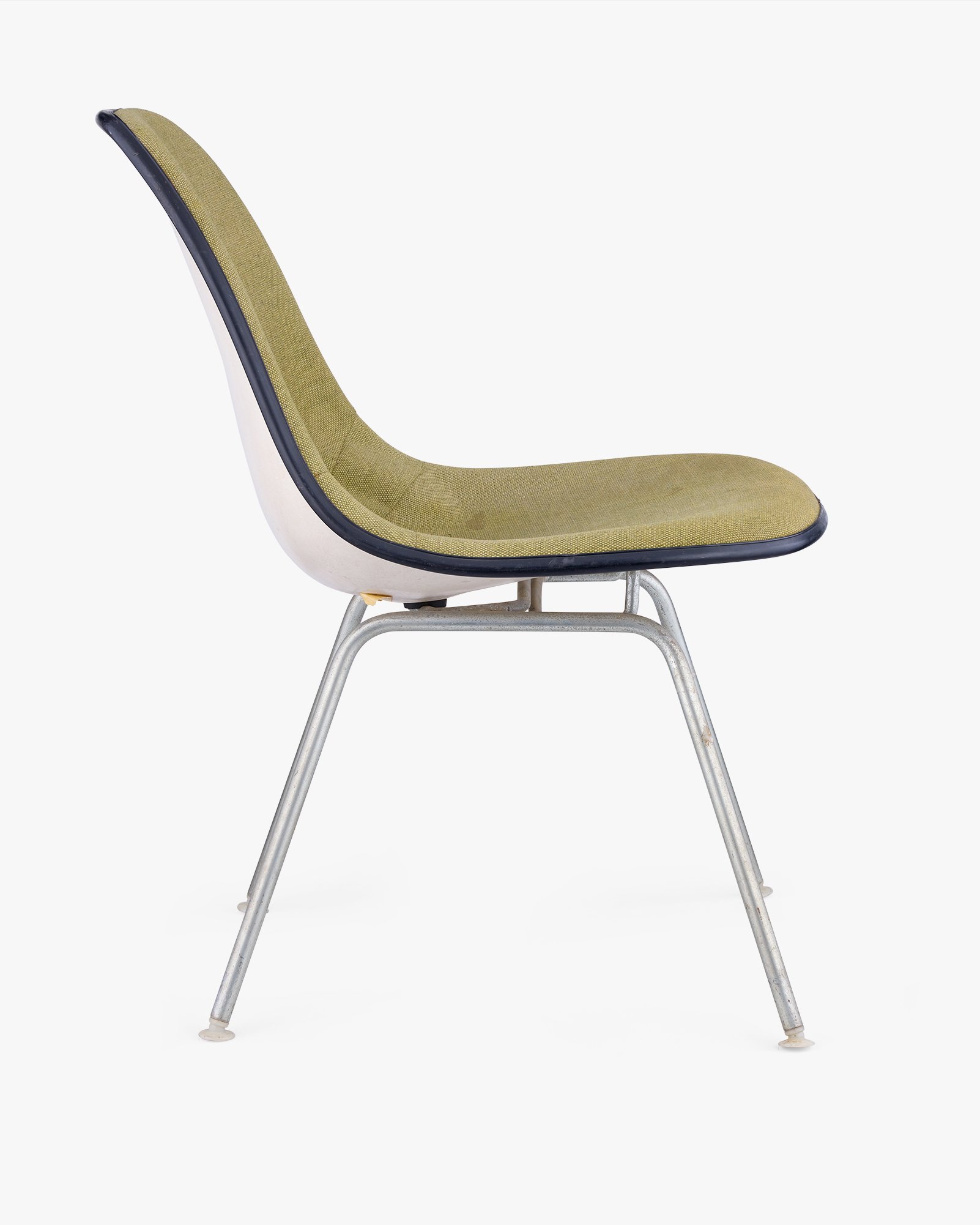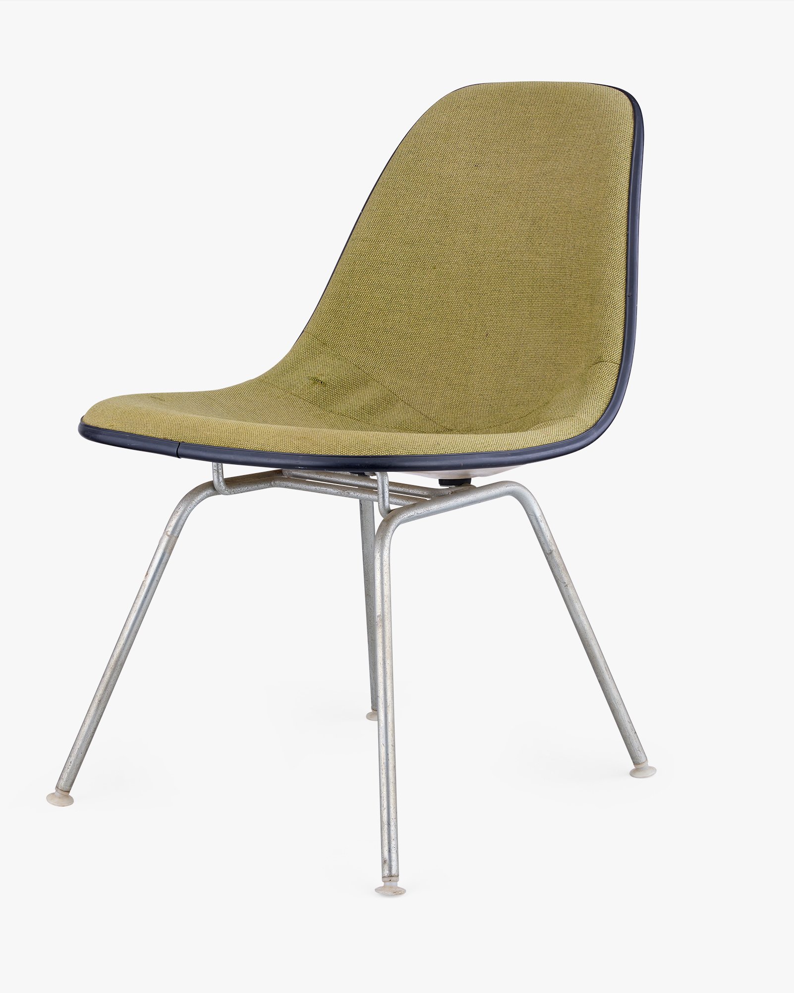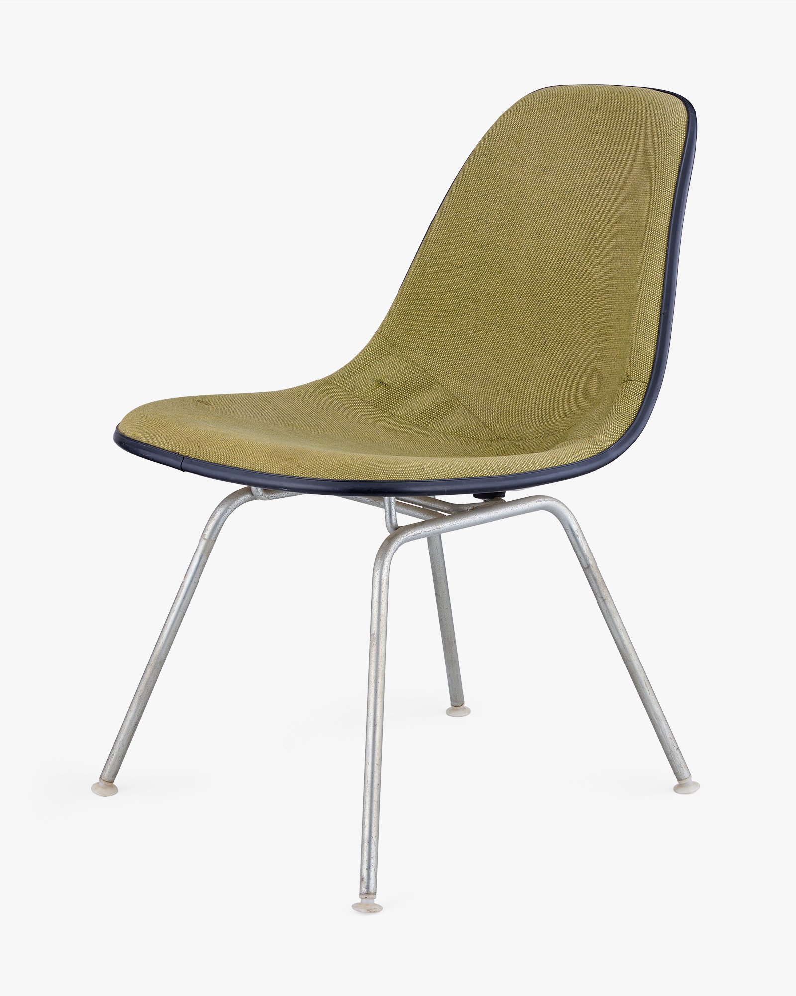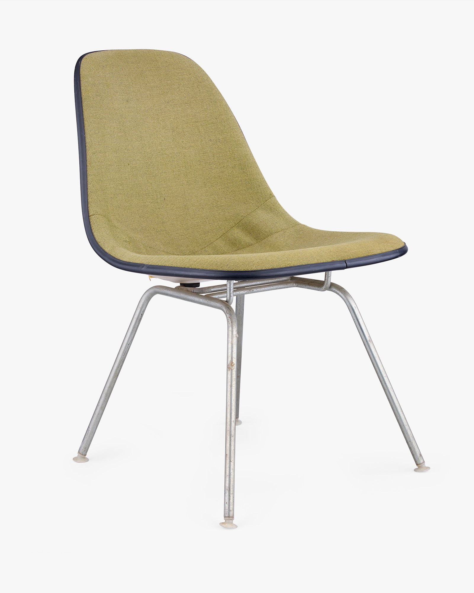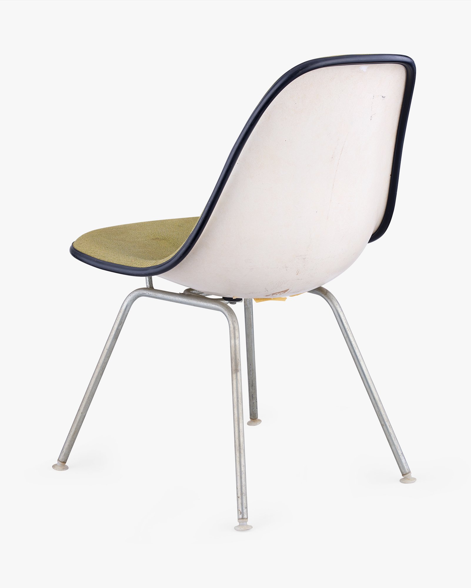 This Parchment shell—the first color introduced in the Side Chair design—is upholstered in Girard Khaki Hopsak and held together by foam-in-place technology. After the upholstery was sewn to the padding and wrapped around the shell, foam was injected between the padding and shell to fuse them together. The plug over the hole on the underside of the site is missing on this example, showing where the foam was injected. MSX-1 stands for Medium (height) Side (chair) X (base) 1 (upholstered).