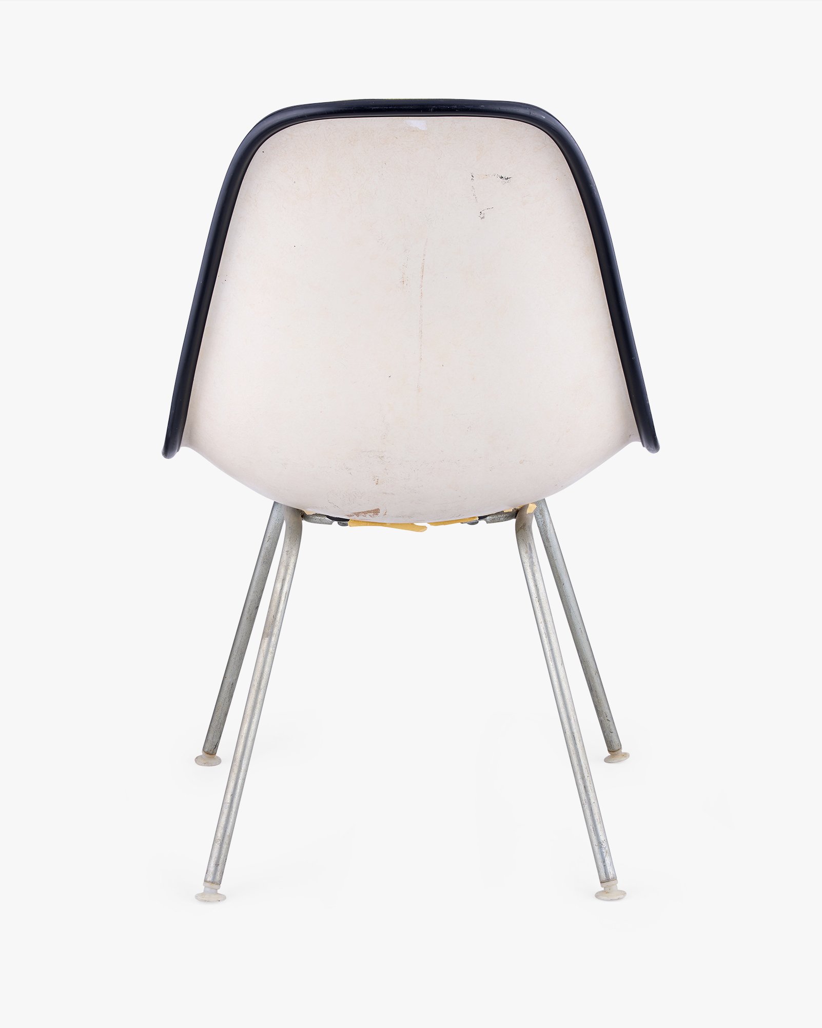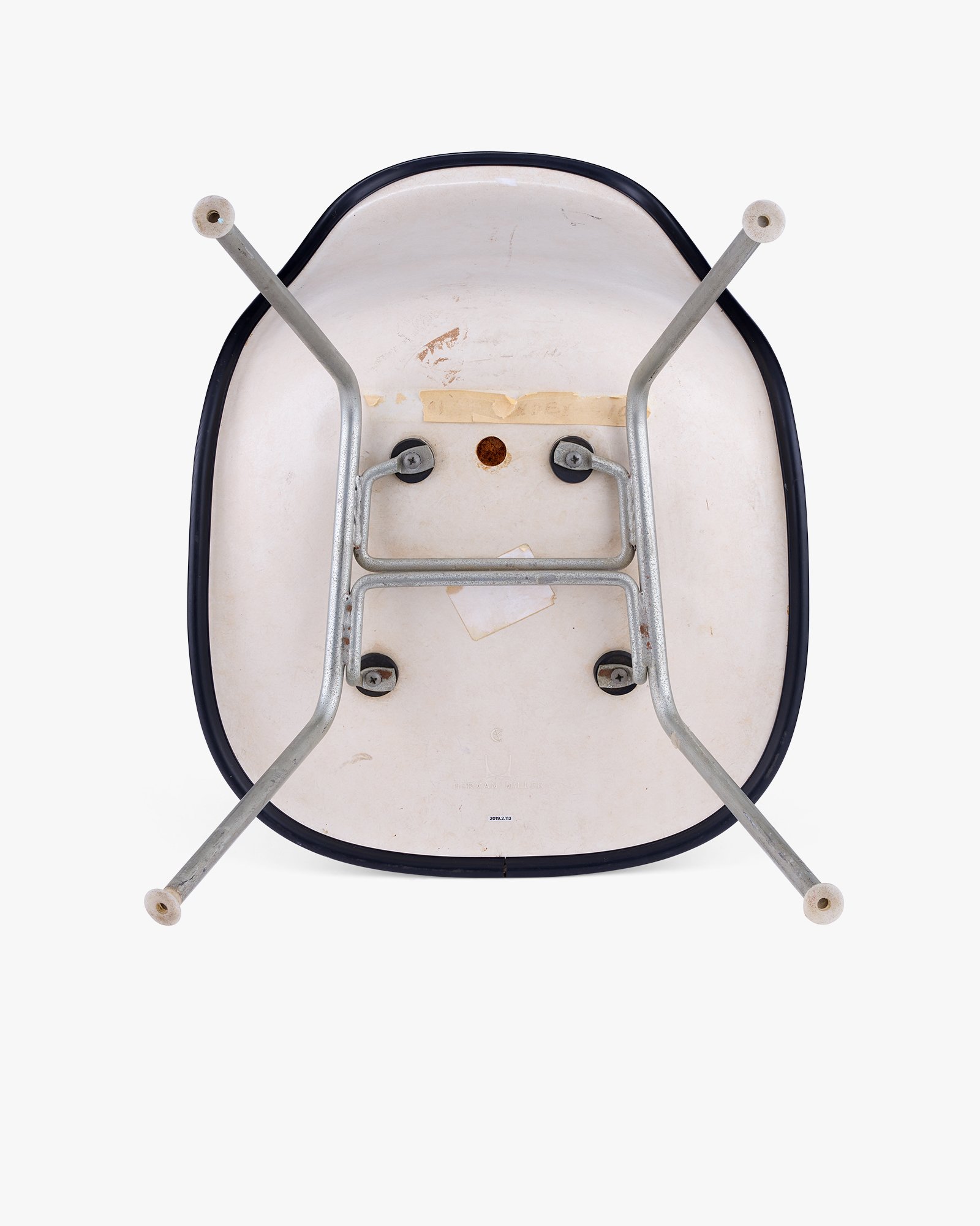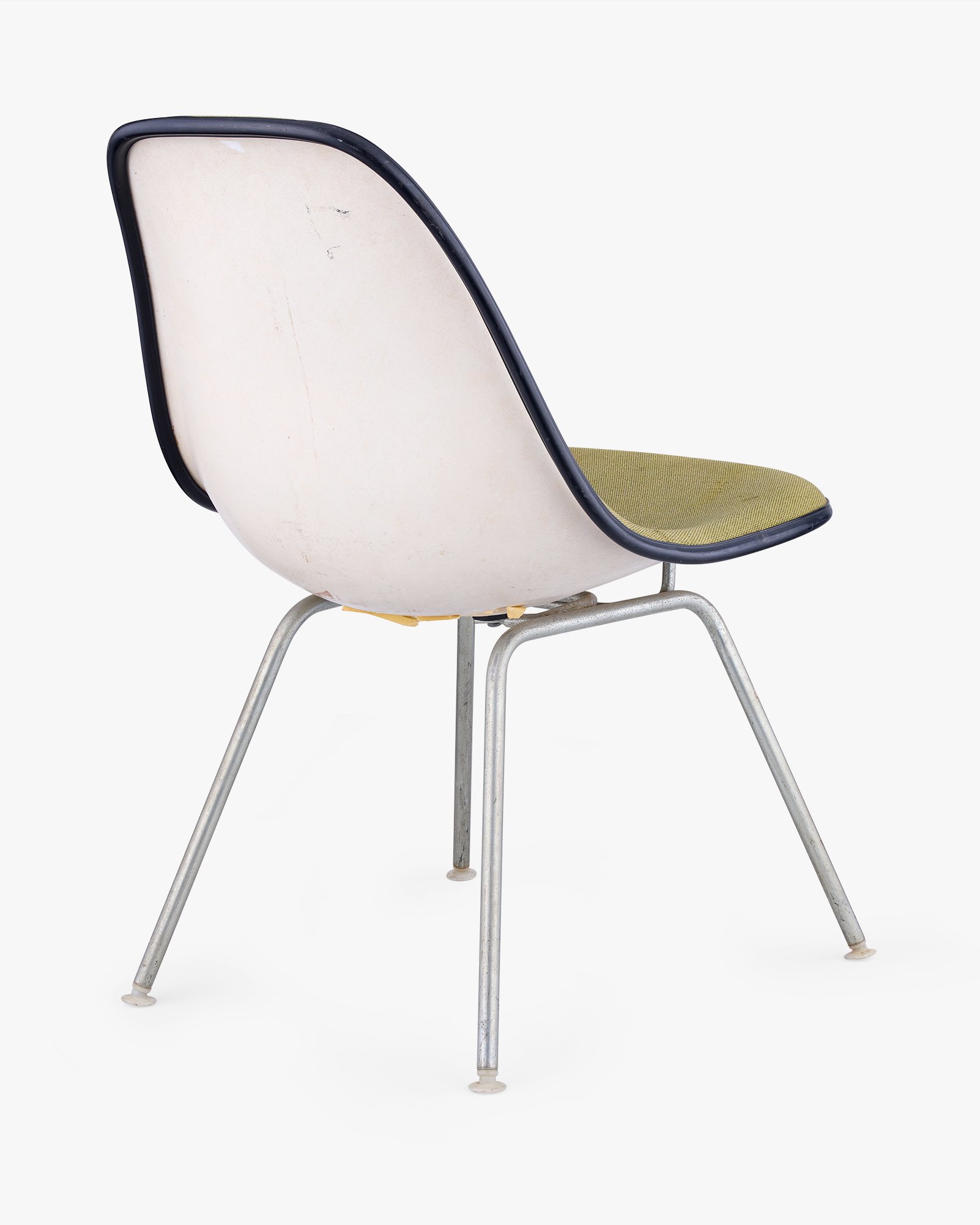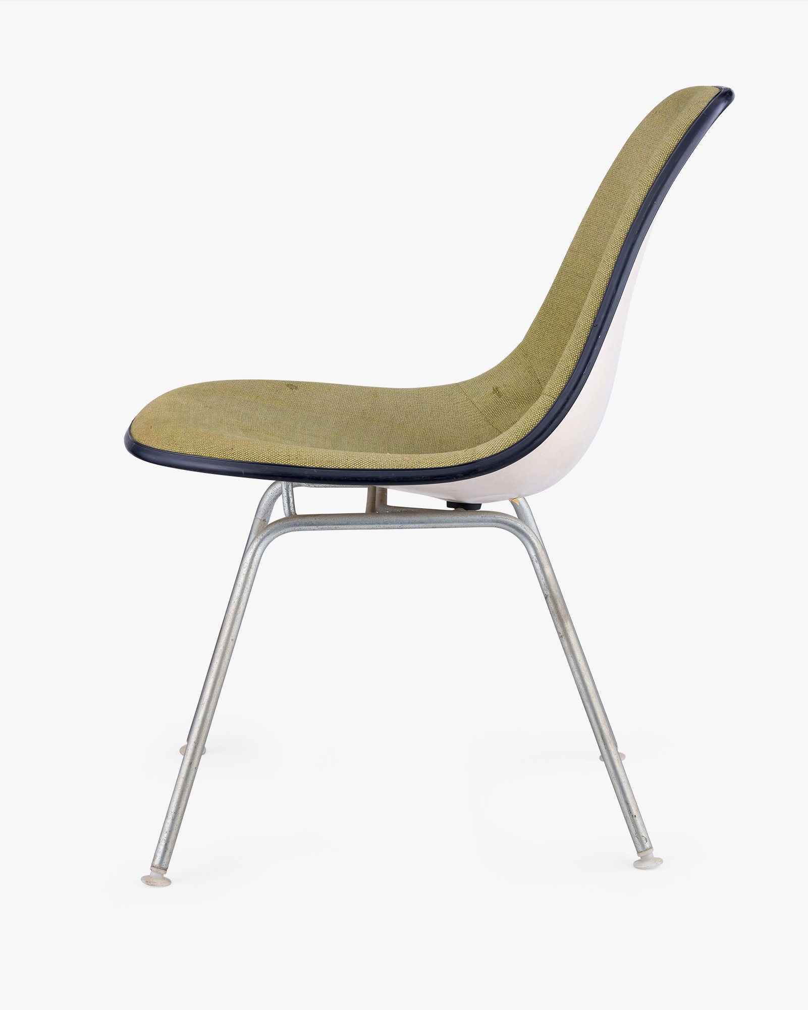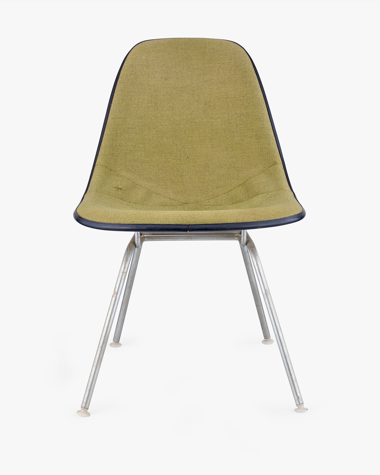 This Parchment shell—the first color introduced in the Side Chair design—is upholstered in Girard Khaki Hopsak and held together by foam-in-place technology. After the upholstery was sewn to the padding and wrapped around the shell, foam was injected between the padding and shell to fuse them together. The plug over the hole on the underside of the site is missing on this example, showing where the foam was injected. MSX-1 stands for Medium (height) Side (chair) X (base) 1 (upholstered).