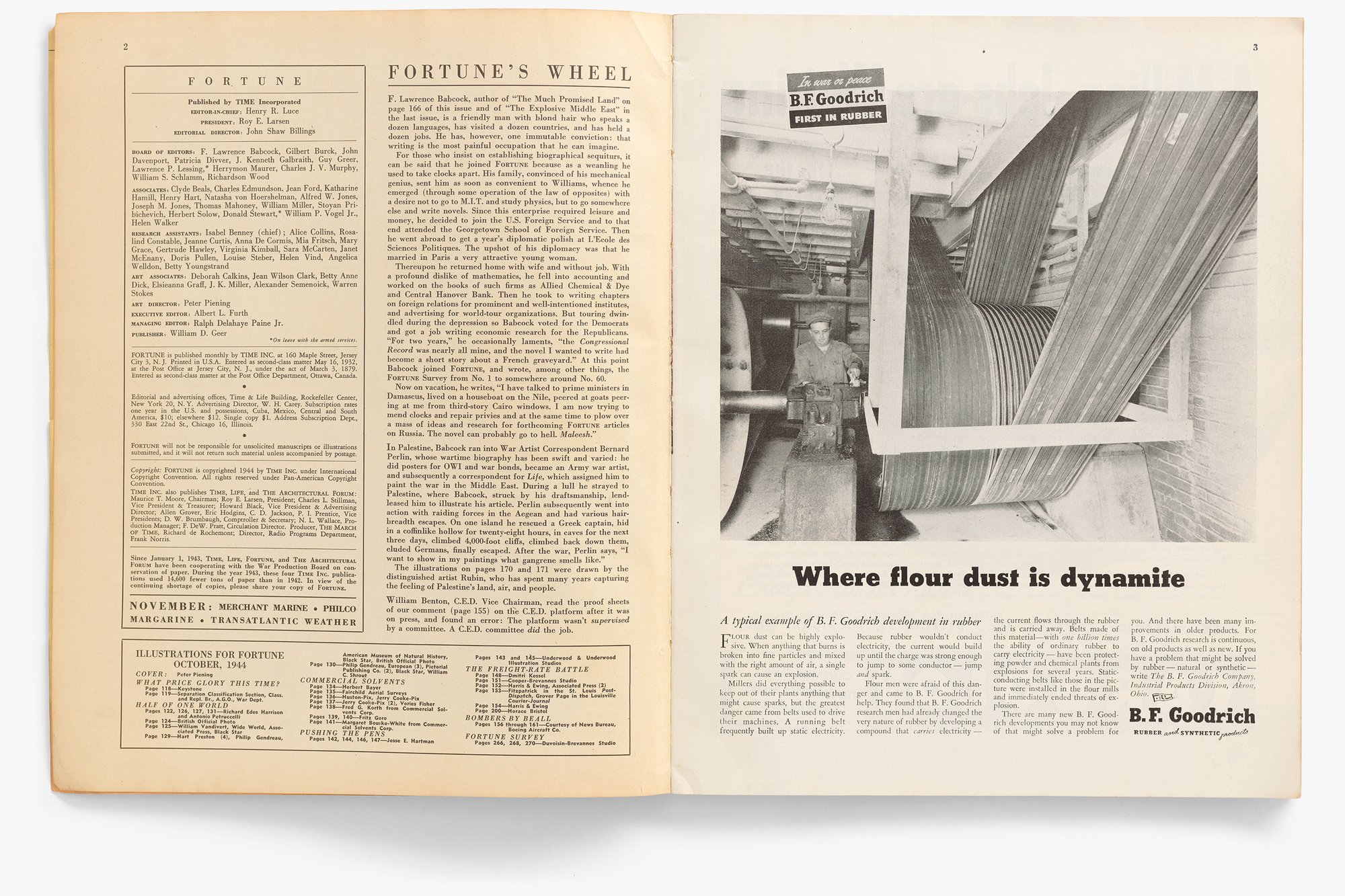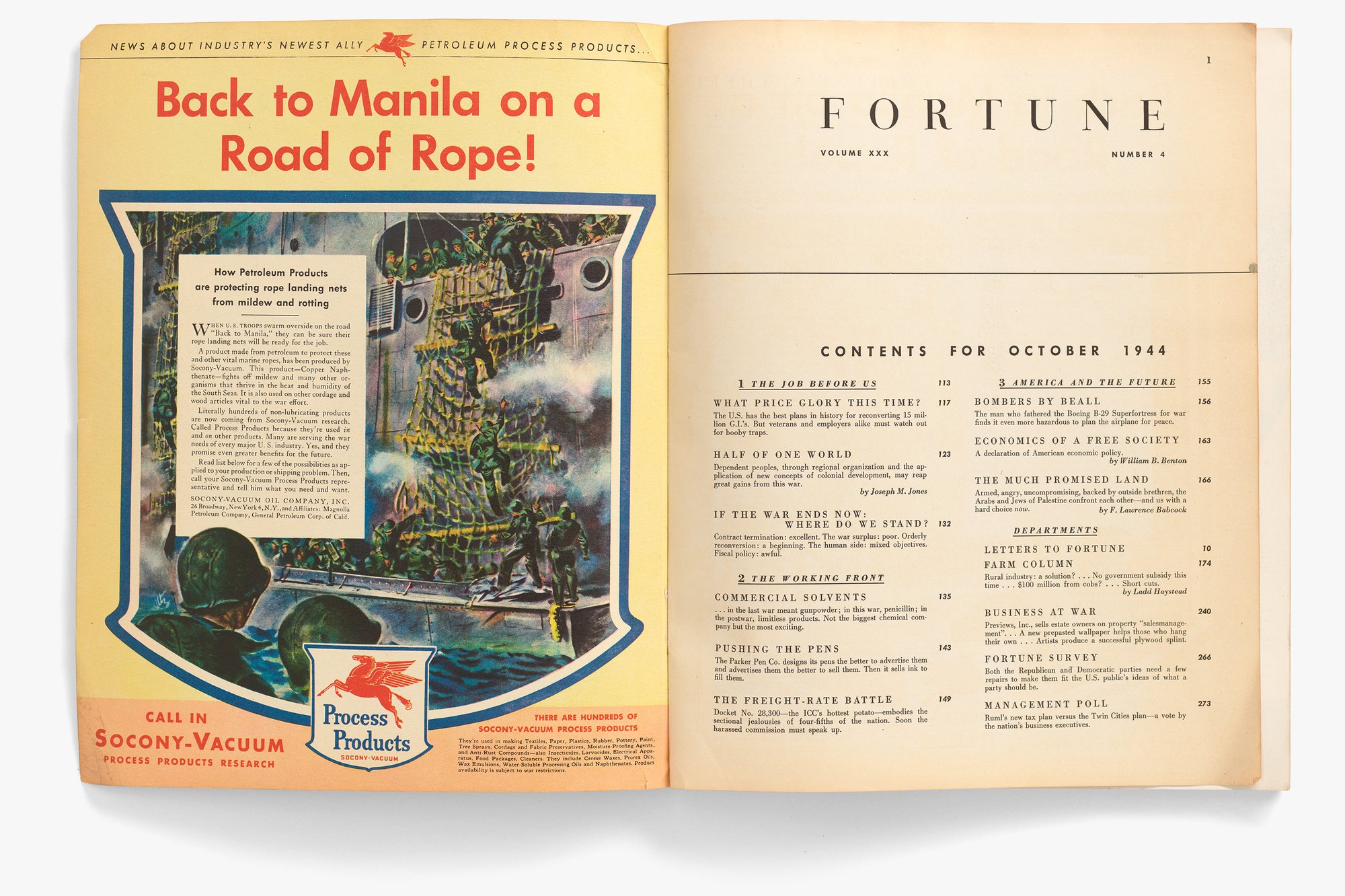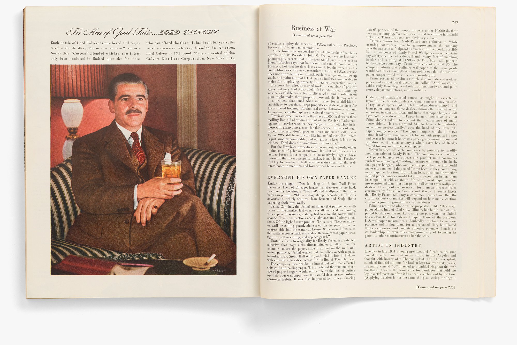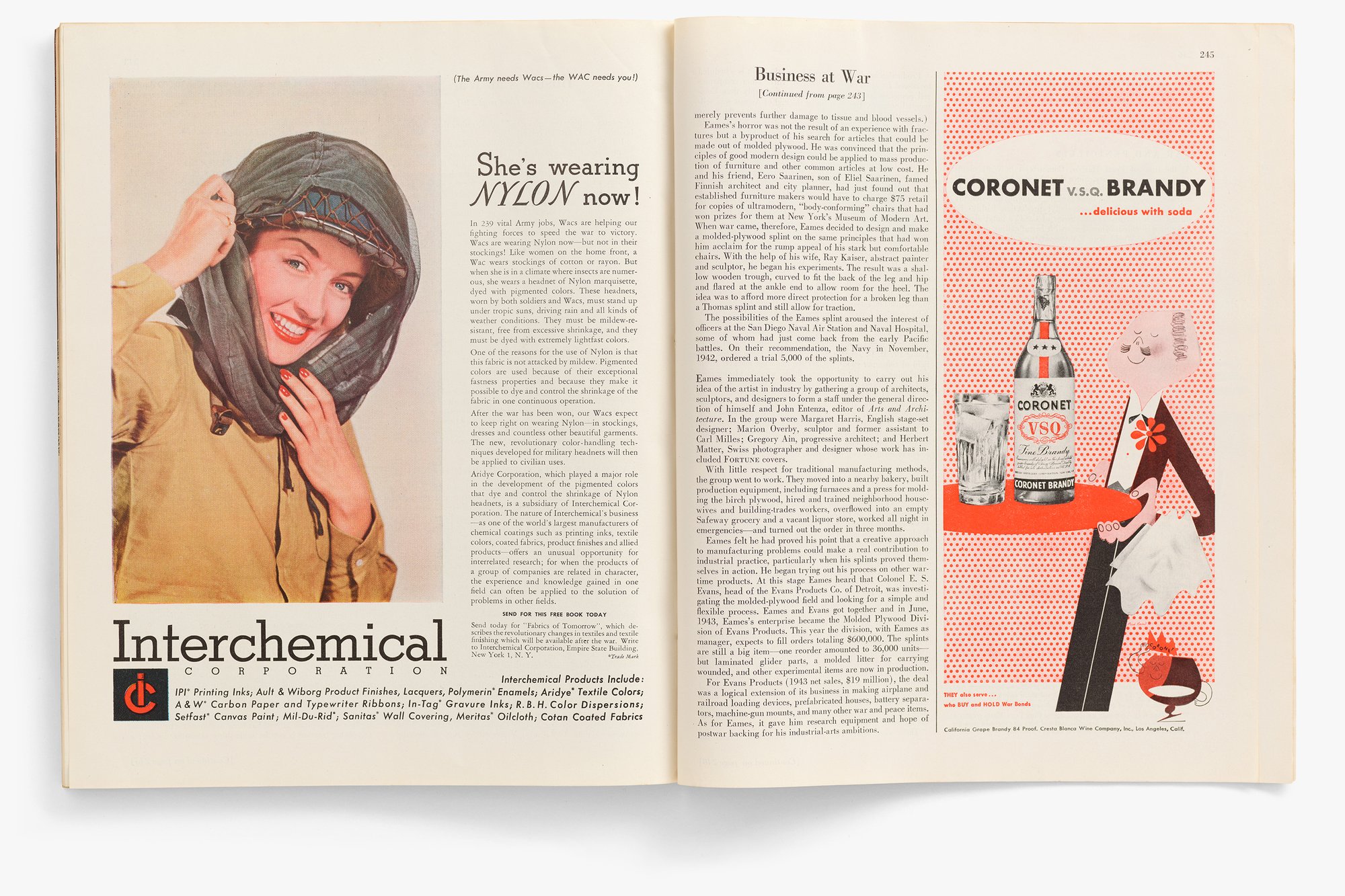 An article entitled “Artists in Industry” in this 1944 issue of Fortune magazine explored the design process used by Ray and Charles. The article states, “Eames immediately took the opportunity to carry out his idea of the artist in industry by gathering a group of architects, sculptors, and designers to form a staff under the general direction of himself and John Entenza, editor of Arts & Architecture. In the group were Margaret Harris, English stage-set designer; Marion Overby, sculptor and former assistant to Carl Milles; Gregory Ain, progressive architect; and Herbert Matter, Swiss photographer and designer whose work has included FORTUNE covers.”
