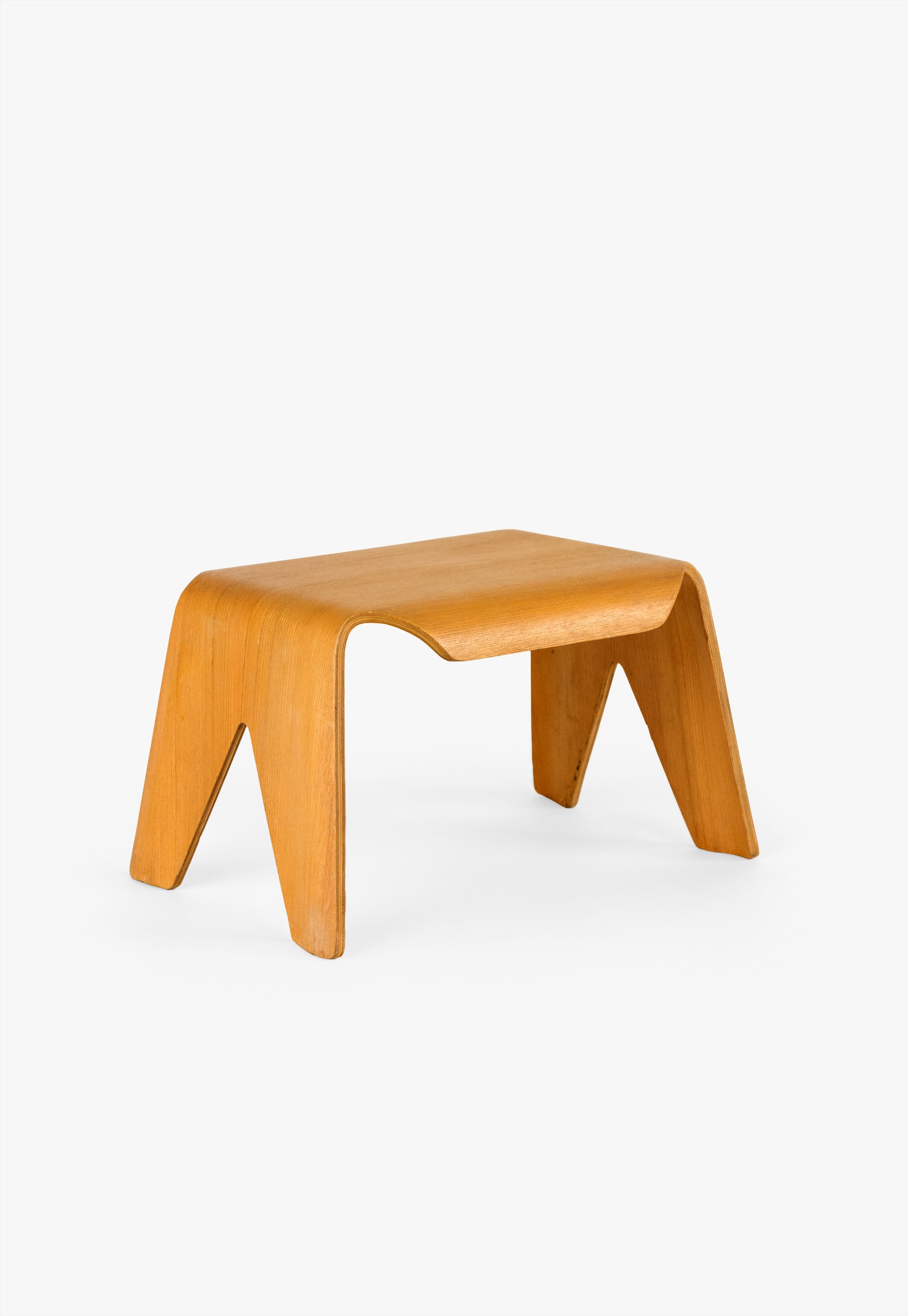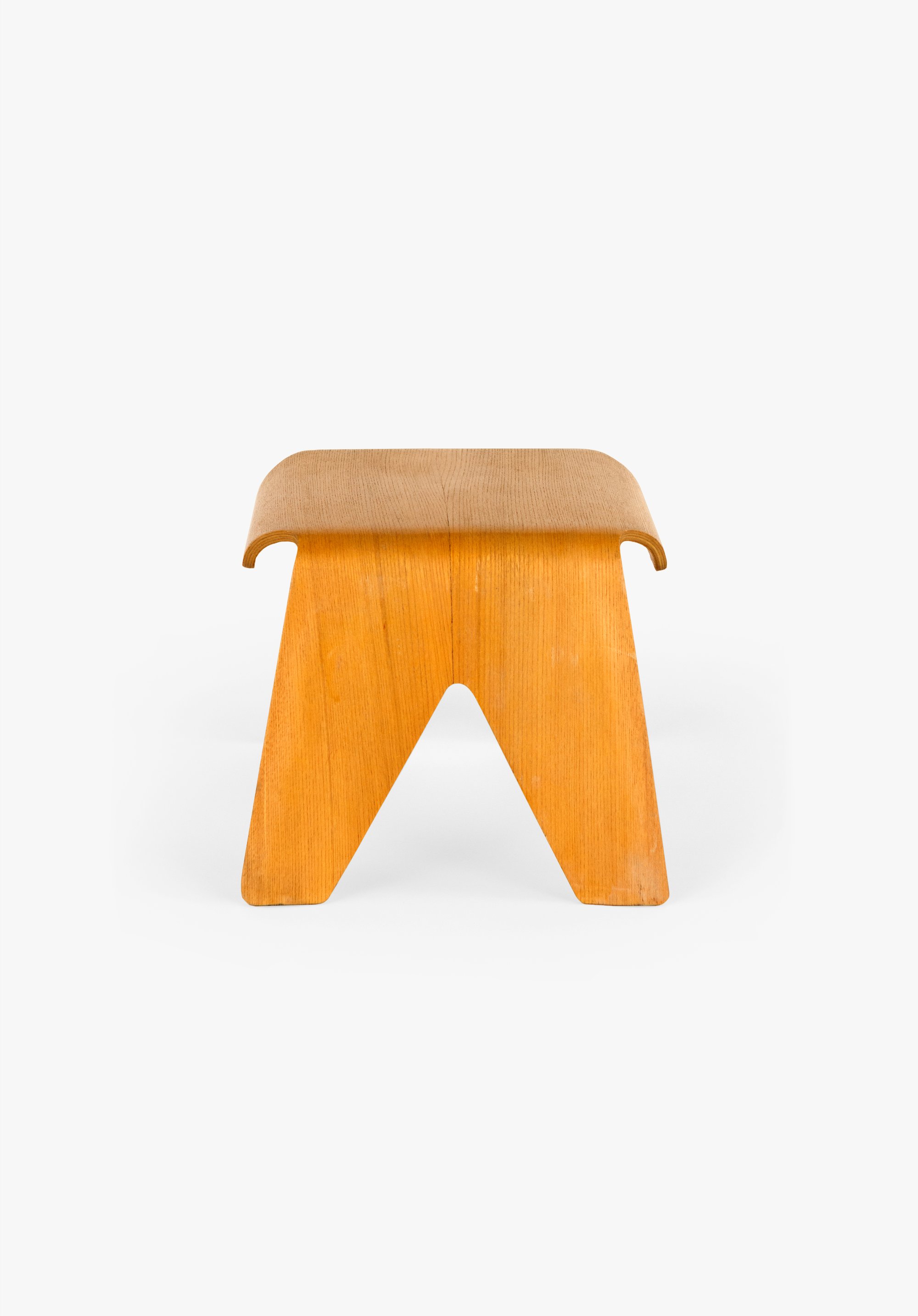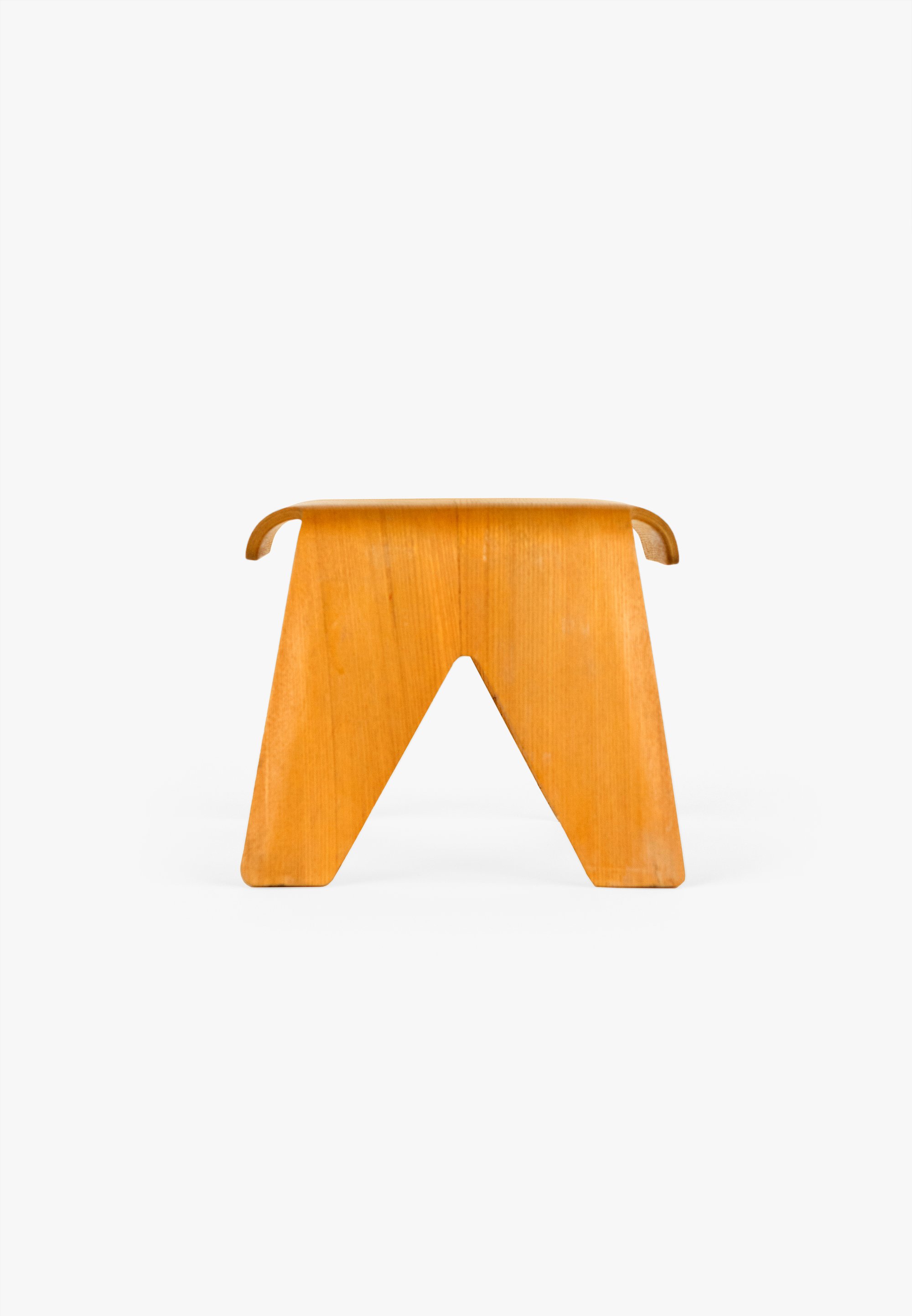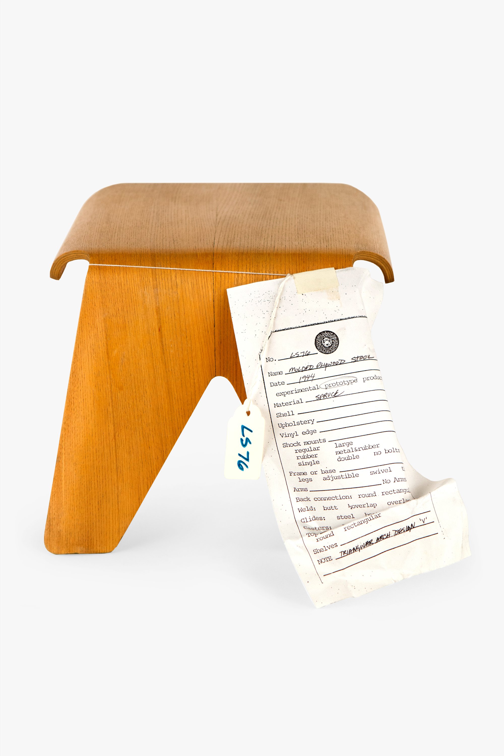 This stackable child’s stool was included in MoMA’s 1946 exhibition New Furniture Designed by Charles Eames. Despite the exposure, Herman Miller declined to distribute the small furniture due to the uncertainty of the children’s market. The Eames Office and a few select retailers, including personal friend, Alexander Girard, were the sole purveyors. Girard later included the stool in An Exhibition for Modern Living at the Detroit Institute of Arts in 1949. The stool was in UCLA’s 1976 exhibition Connections: The Work of Charles and Ray Eames.