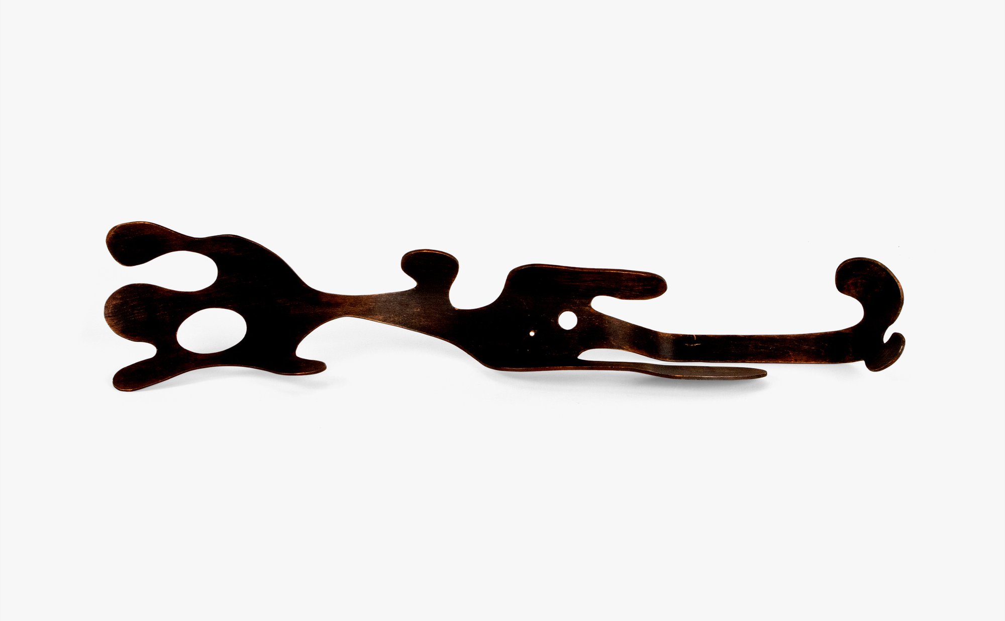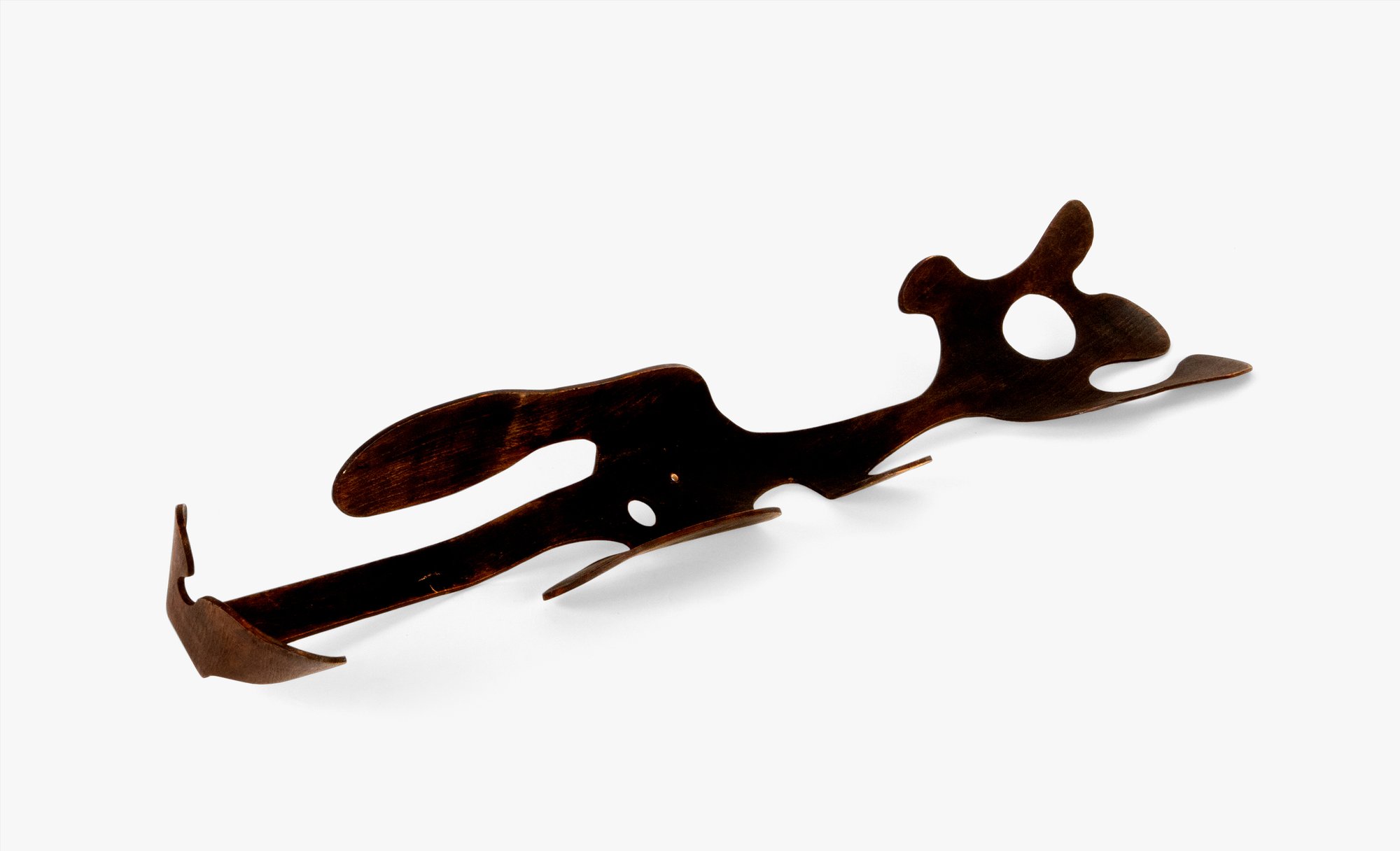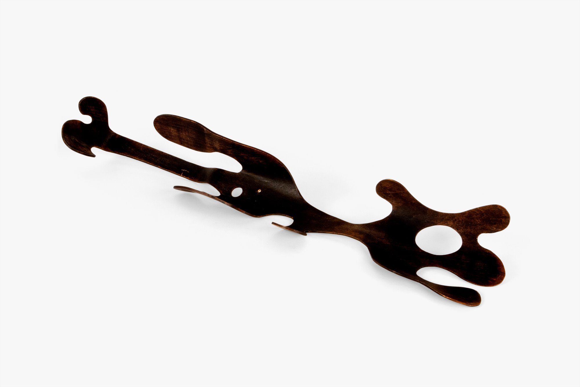 Ray and Charles used the three-dimensional form of the leg splint to bring her two-dimensional sketch to life. The striking black form shares a visual language with the Eameses’ logo design for their company at this time, the Molded Plywood Division of the Evans Products Company. This piece, cut with a scroll saw and then stained black, is one of only three known splint sculptures. The design suggests it was meant to be suspended, like a mobile.