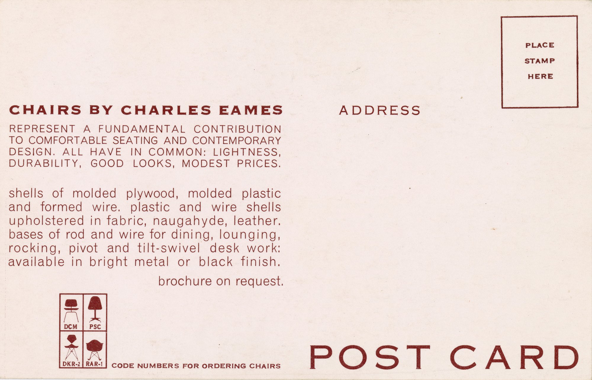 By 1954, the Eameses had designed three distinctive systems of furniture for Herman Miller: the molded plywood, molded plastic, and upholstered wire chairs. This postcard, staged and photographed at the Eames Office, features configurations from each of these groups. Clockwise from the upper left, there is a calico ash DCM, a parchment fiberglass PSC (astute observers will note the earliest contract base), an upholstered fiberglass rocking chair (the RAR-1), and an upholstered wire DKR-2 (with the strong and lightweight “Eiffel Tower” base). The postcard’s colorful and distinctively styled vignettes are not only eye-catching but speak to why Charles and Ray Eames conceived of chairs as systems rather than individual products. The variations afforded by different configurations (of overall designs, as well as materials, bases, and upholsteries), offered almost limitless solutions for different purposes, characters, activities, environments, and budgets. To complement each chair design and further establish the distinctive character of the vignettes, Charles and Ray selected “humble materials,” including a tumbleweed, ceramic fish, flower arrangements, fruit, handcrafted wooden toys, and a woven bowl. Everyday goods such as these were a mainstay of the Eames styling vocabulary and offset the modernist mass-produced aesthetic of the chairs with a naturalistic and human spirit.