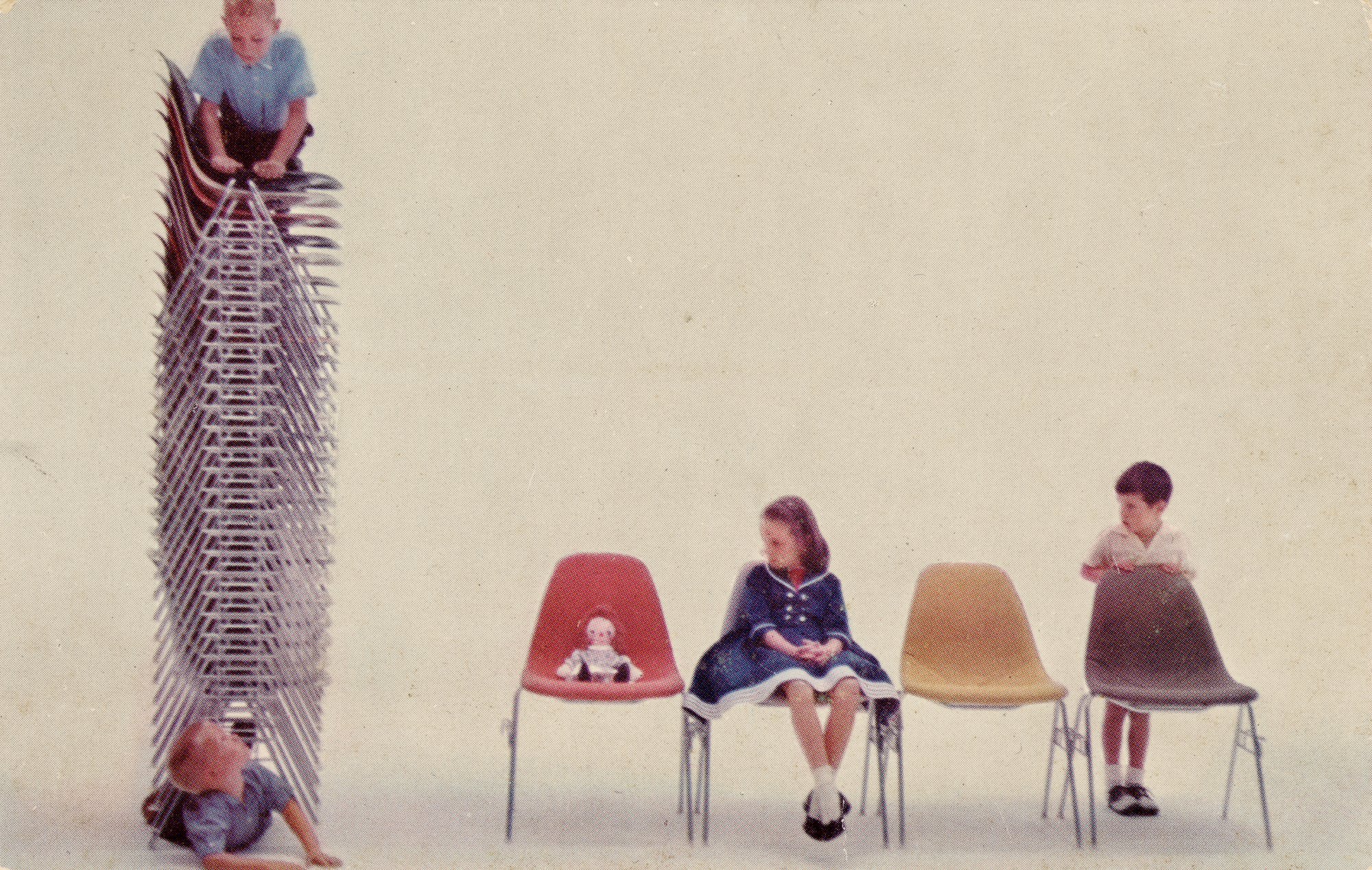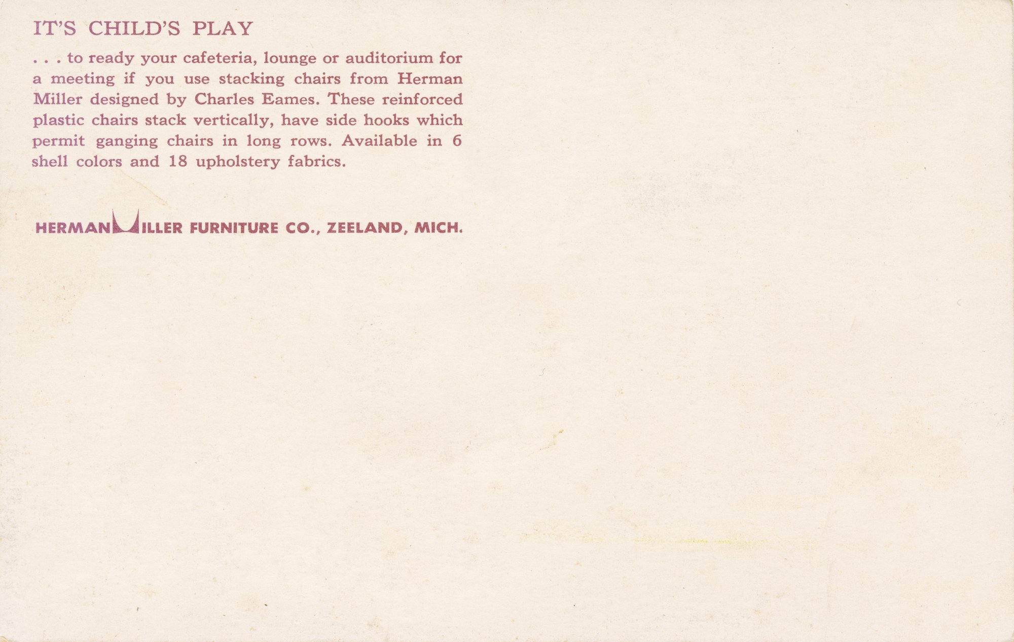 Although the Eames molded plastic chair line was introduced in 1950, sales didn't take off in a significant way until 1954, when Ray and Charles Eames created the stacking and ganging chairs known by their alphanumeric sales code designation, DSS. [Following the same convention as other Eames designs, DSS stands for Dining (height) Side (chair) Stacking (base).] The newly conceived chair base allowed up to 14 chairs to stack in the floor space of one, and the ganging feature that allowed the chairs to interlock on either side helped facilitate the creation of long tidy rows. With this adaptation orders increased tenfold as the chairs were now ideal for settings such as auditoriums, gymnasiums, and classrooms. This promotional postcard illustrates both aspects of the expanded functionality offered by the new design—albeit with some adventurous behavior that would be unsanctioned in most institutional settings.