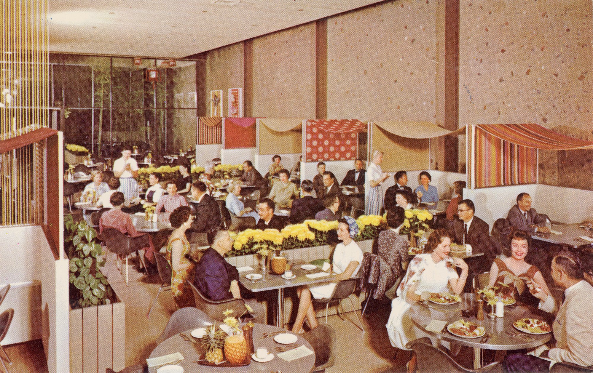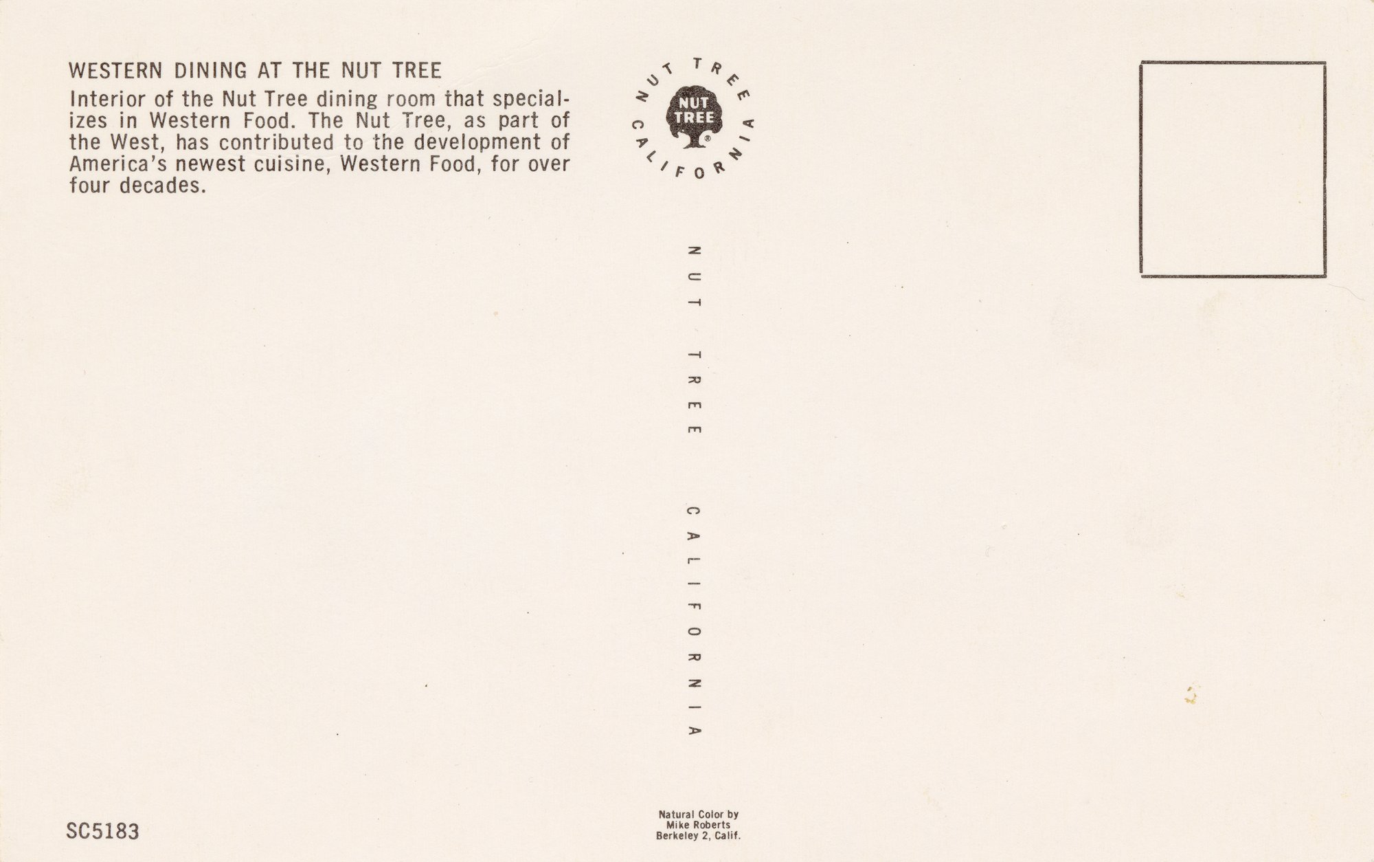 Located in Vacaville, California, on Interstate 80, the Nut Tree originated as a fruit stand in 1921 and by mid-century had evolved to become a landmark roadside destination for travelers between the Bay Area and Lake Tahoe. As Diane Power Zimmerman explains in Nut Tree: From a California Ranch to a Design, Food, and Hospitality Icon, “for seventy-five years, Nut Tree defined Western food, mid-century design, and cutting-edge hospitality. They served ordinary folks and dignitaries alike, including Ronald Reagan, Neil Armstrong, and Queen Elizabeth II.” Shaped by design director Don Birell, who began working there in 1952, for many years the Nut Tree successfully straddled the fine line between whimsy and modernism to create a destination that would be fun for all ages. In the main dining room, Eames molded plastic chairs were paired with yardage of Alexander Girard textiles to offer a memorable venue for partaking in all that “western dining” had to offer.