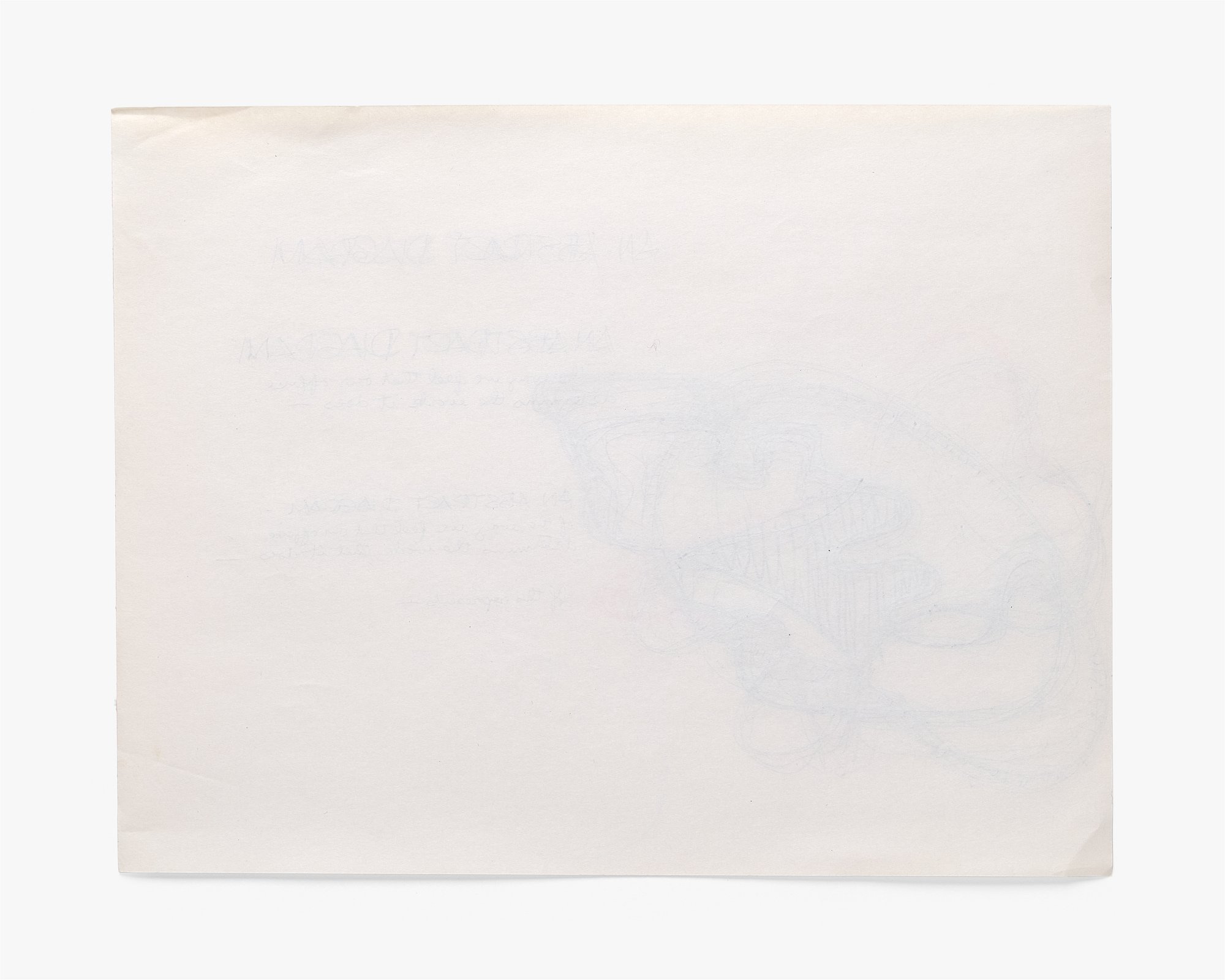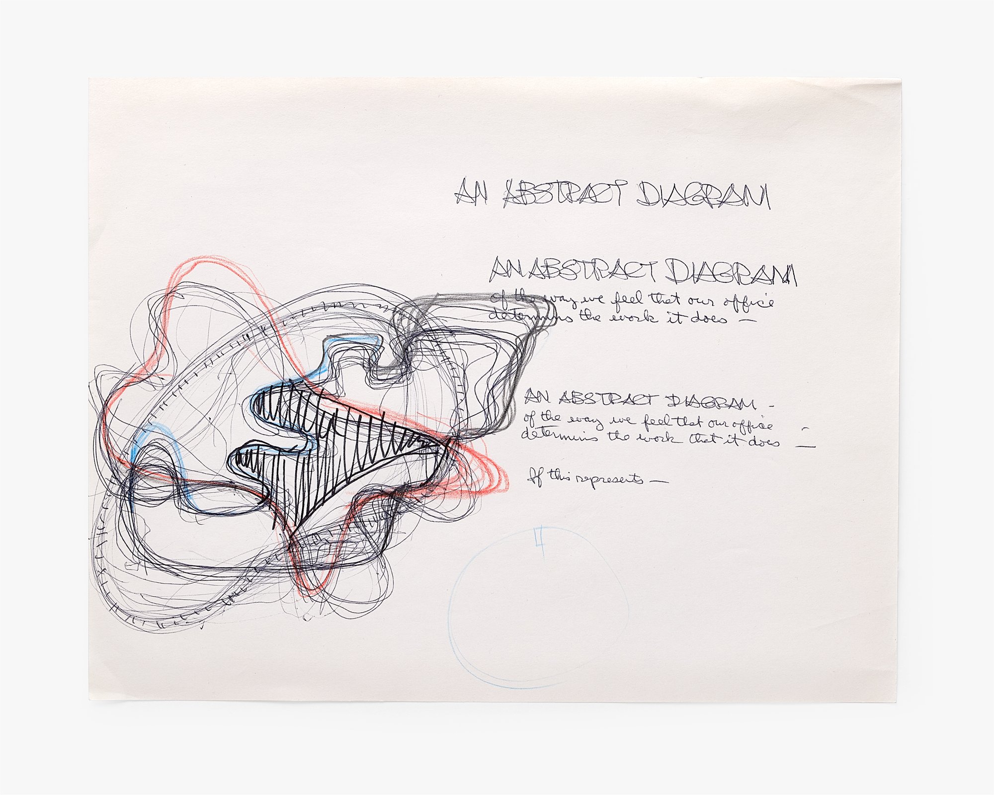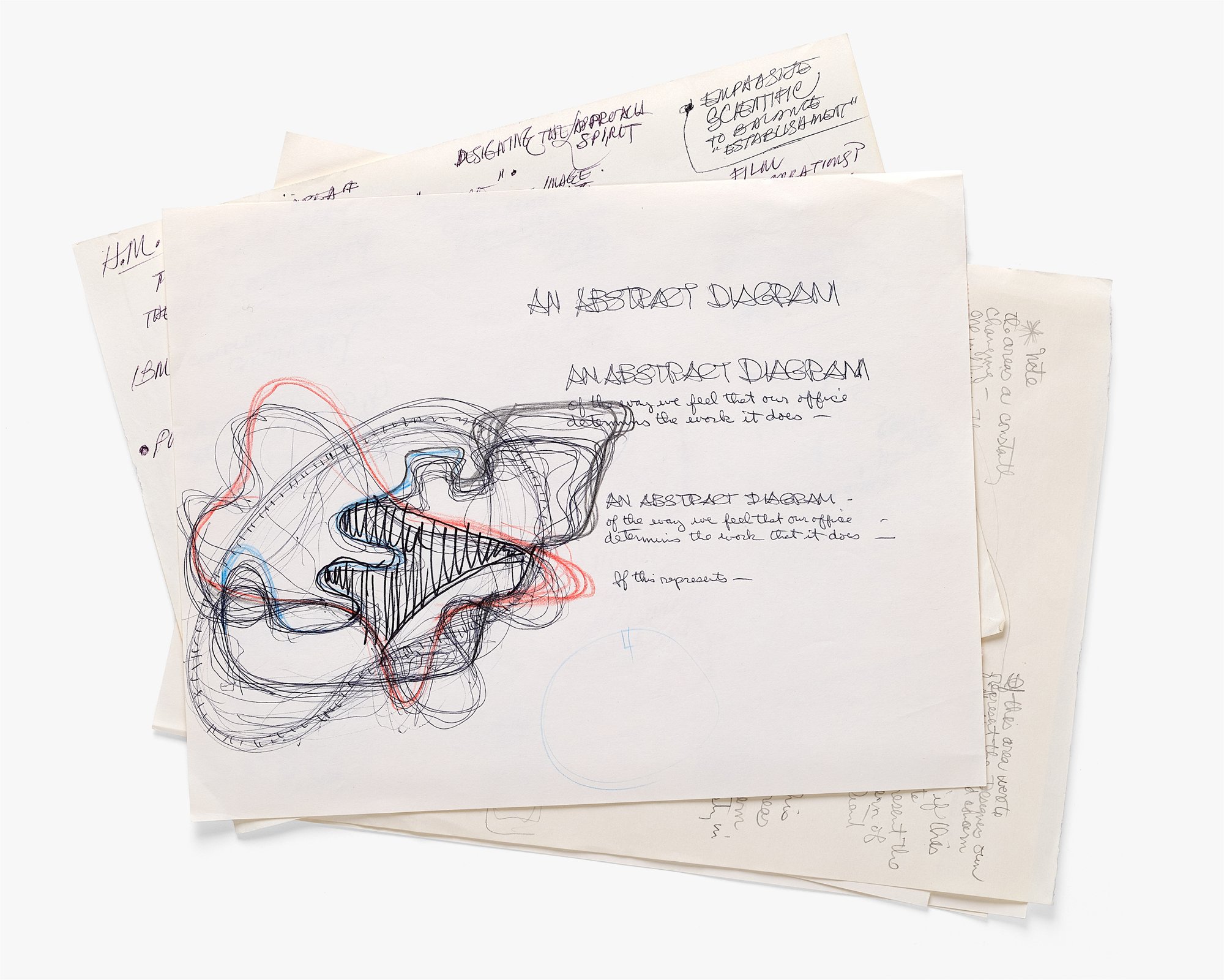 Ray’s depiction of “an abstract diagram” relates closely to a better-known drawing by Charles that was shown alongside examples of their work in the 1969 group exhibition What Is Design? at the Musée des Arts Décoratifs in Paris. Charles’s version included labels explaining that the intersecting forms represented the concerns of: (1) a design office, (2) its clients, and (3) “society as a whole.” The overlap between them, he concluded, is where “the designer can work with conviction and enthusiasm.” While the exhibited diagram offered a clear explanation of its meaning, Ray’s leaves more room for interpretation. Rather than labeling its parts, she provides an overall caption: “an abstract diagram of the way we feel that our office determines the work that it does.” This statement appears not once but twice, creating a sense of repetition or even iteration. Iteration, meaning repetition with variation aimed towards a preferable solution, was an essential element of the Eameses’ design process. This concept is also present in the diagram itself, where each form has been gone over many times with pen, pencil, or both.