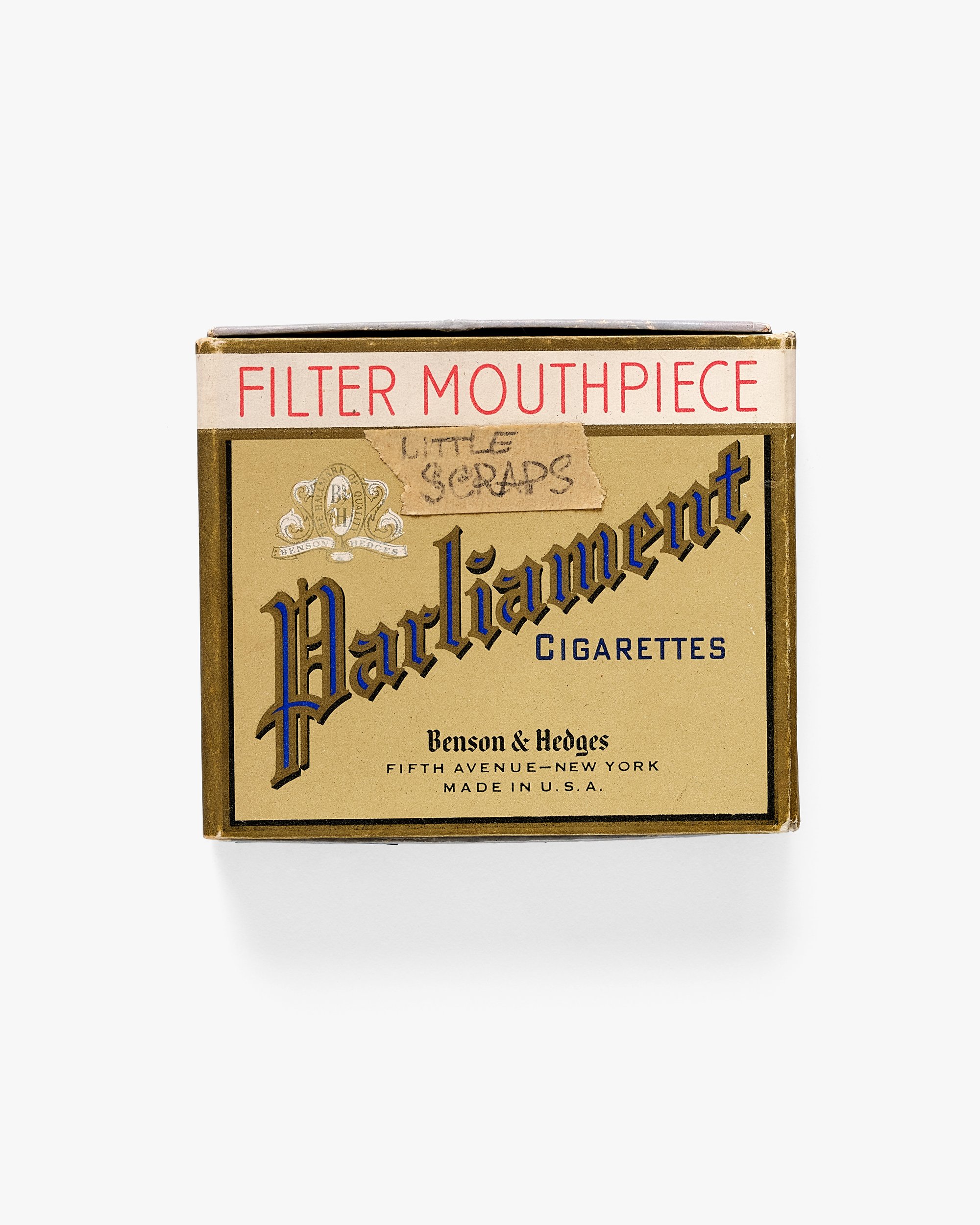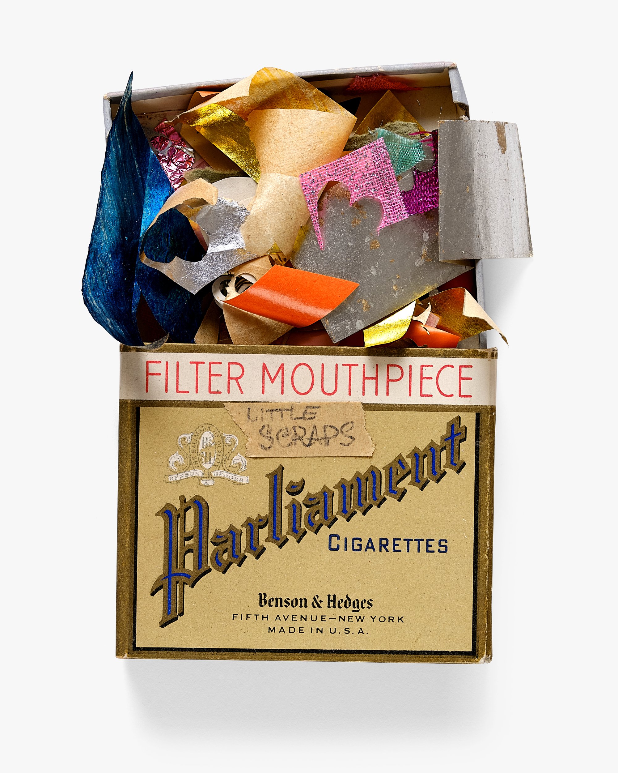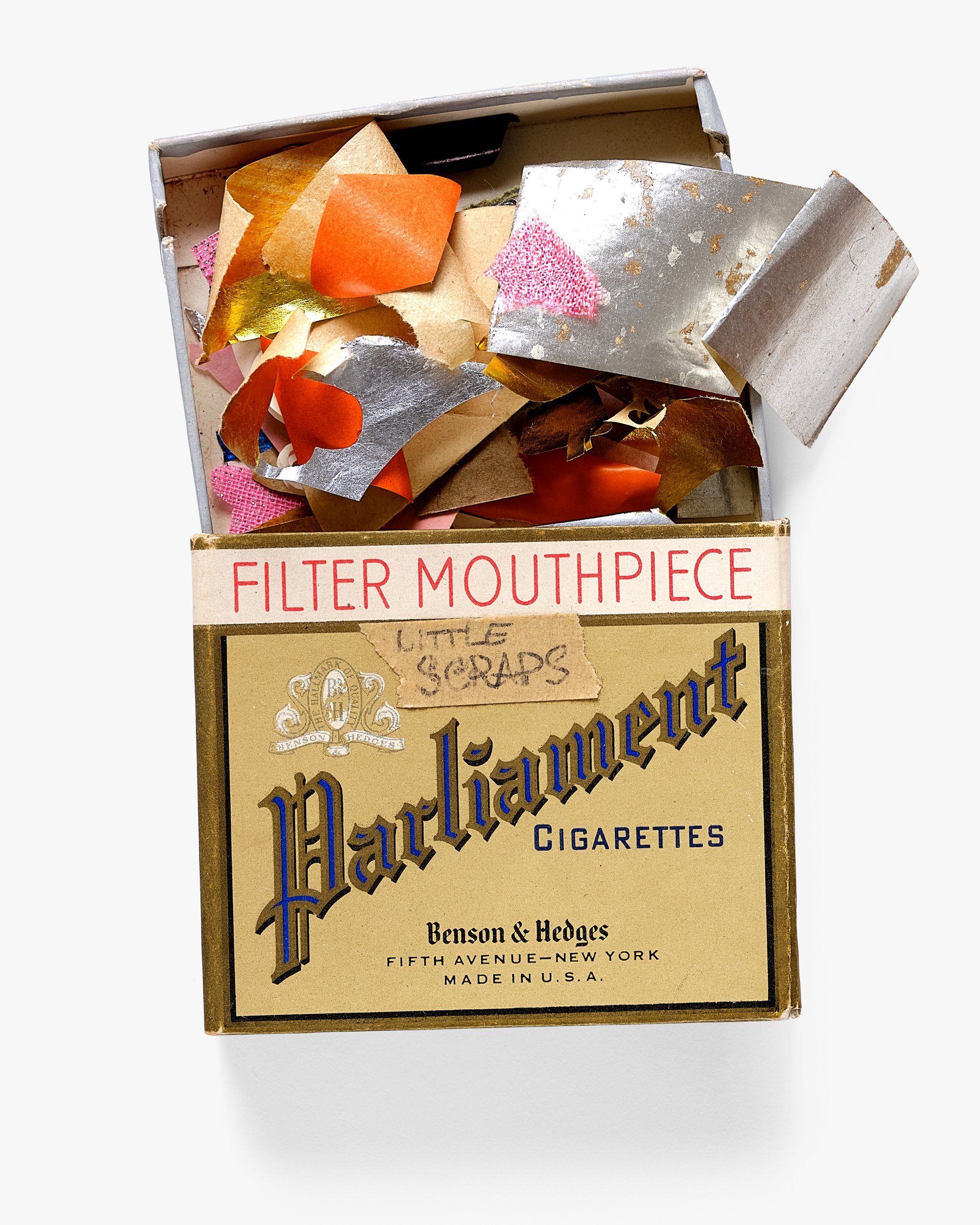 This box and its contents give a sense of the scrupulous manner in which Ray collected, organized, and stored bits and pieces of material inspiration, from fine papers to handwritten notes to fabrics, as is the case here. The box, which once held Parliament cigarettes, was re-purposed by Ray as a container for what she labeled “Little Scraps” and stored inside a drawer that also held larger paper pieces. Her desire to gather and preserve these snippets is unsurprising given how integral paper and collage were to her creative process–especially at diminutive scales where even the littlest scrap could still be of use.