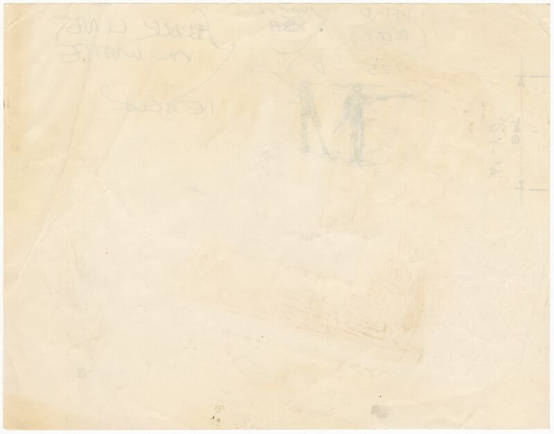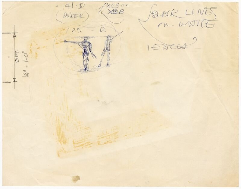 This drawing is an early study by Ray for a flyer promoting the Eames Contract Storage, or ECS, system of modular furniture that was produced by Herman Miller beginning in 1961. It includes a rough sketch of two human figures standing side-by-side, each portrayed in a slightly different upright pose with one extended arm. “Dürer” is one of several notes made above them, indicating that the figures were inspired, at least in part, by the work of German Renaissance artist Albrecht Dürer. Specifically, they reference Dürer’s studies of human proportions, which explored the beauty to be found in a wide variety of human bodies and were published posthumously as the Four Books on Human Proportions in 1528. Dürer’s embrace of human diversity challenged the singular and idealized representations of the human form that were prevailing in his time, epitomized by Leonardo da Vinci’s iconic drawing of the Vitruvian Man. By including this reference in promotional material for the ECS system, the Eameses seem to be suggesting that their designs do not envision one particular ideal user, but are instead intended to be useful to everyone and anyone.