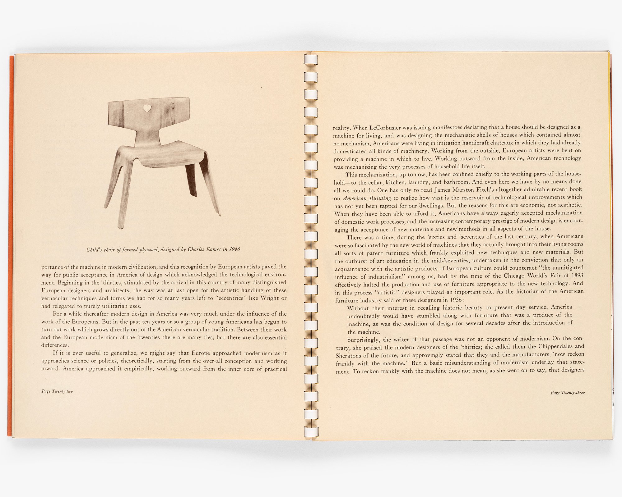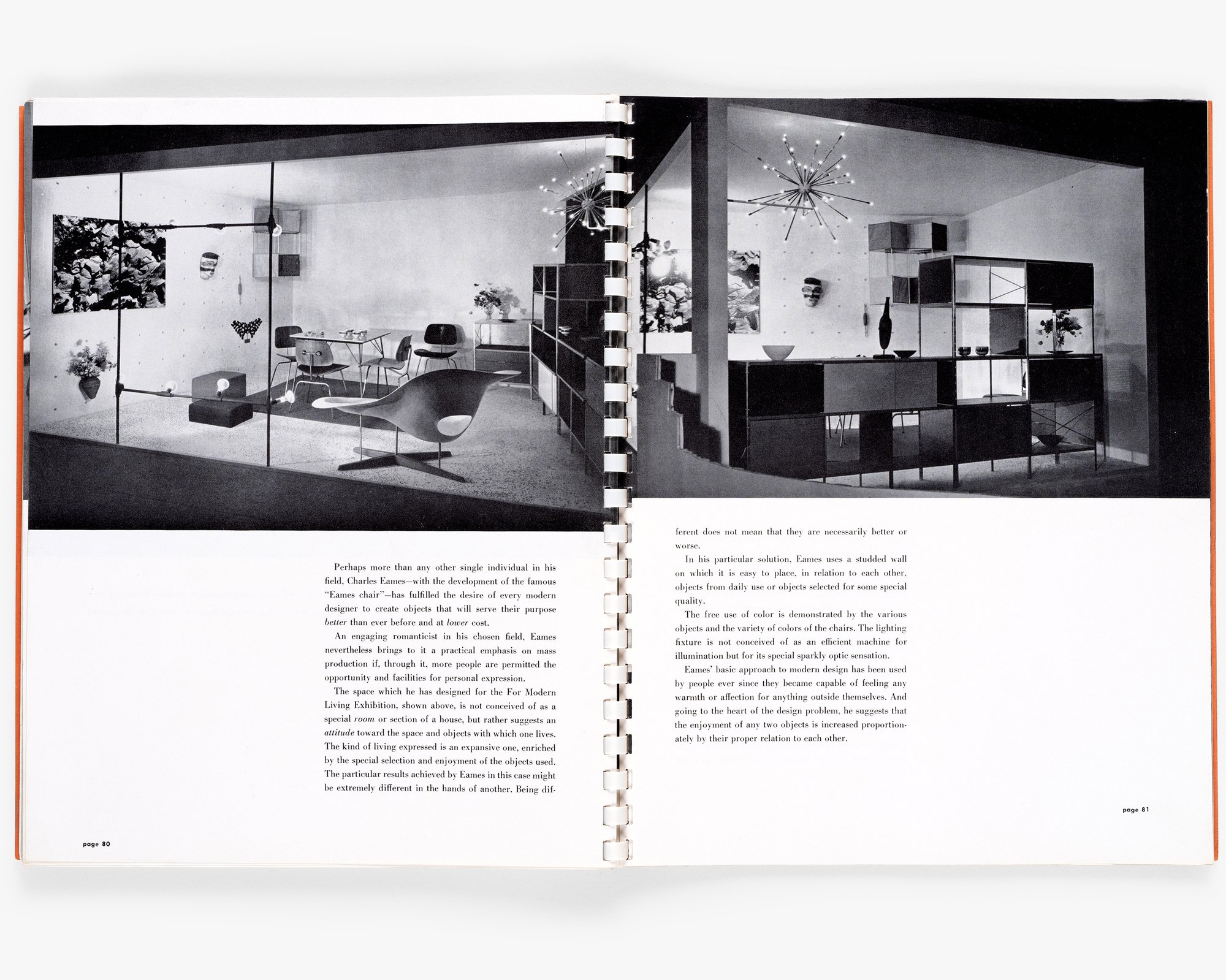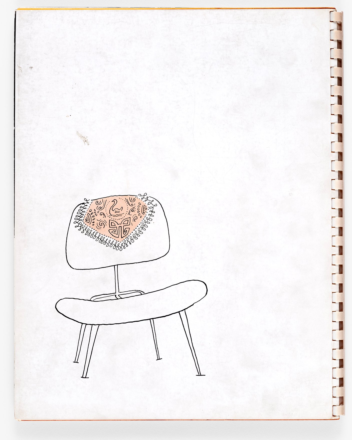 Saul Steinberg likely first crossed paths with the Eameses when they participated in An Exhibition for Modern Living at the Detroit Institute of Arts, a showcase of modern design that was organized by the Eameses’ close friend Alexander Girard in 1949. The exhibition included a “Hall of Objects” displaying various housewares as well as seven rooms by leading designers, including George Nelson, Eero Saarinen, and the Eameses. The Eames room featured their molded plywood chairs arranged around a folding table, a prototype of the La Chaise lounge chair, and multiple Eames Storage Units—all enlivened by bouquets of flowers, paper kites, and a light fixture dubbed the Galaxy Light that resembled both a model of an atom and a starburst. Steinberg’s distinct contribution to the show was a series of drawings photographically enlarged into a mural that depicted the panoply of design in modern life through his unique artistic lens. The exhibition was extensively documented in this catalog, which includes numerous examples of Eames furniture and drawings by Steinberg, many of which speak to the evolving tension between traditional and modern styles. The drawing that appears on the catalog’s cover illustrates this relationship by depicting a man engrossed in a newspaper. He sits on a simple modern side chair while the ornate armchair before him is reduced to a footrest, making a clear statement of preference for modern styles over traditional ones.