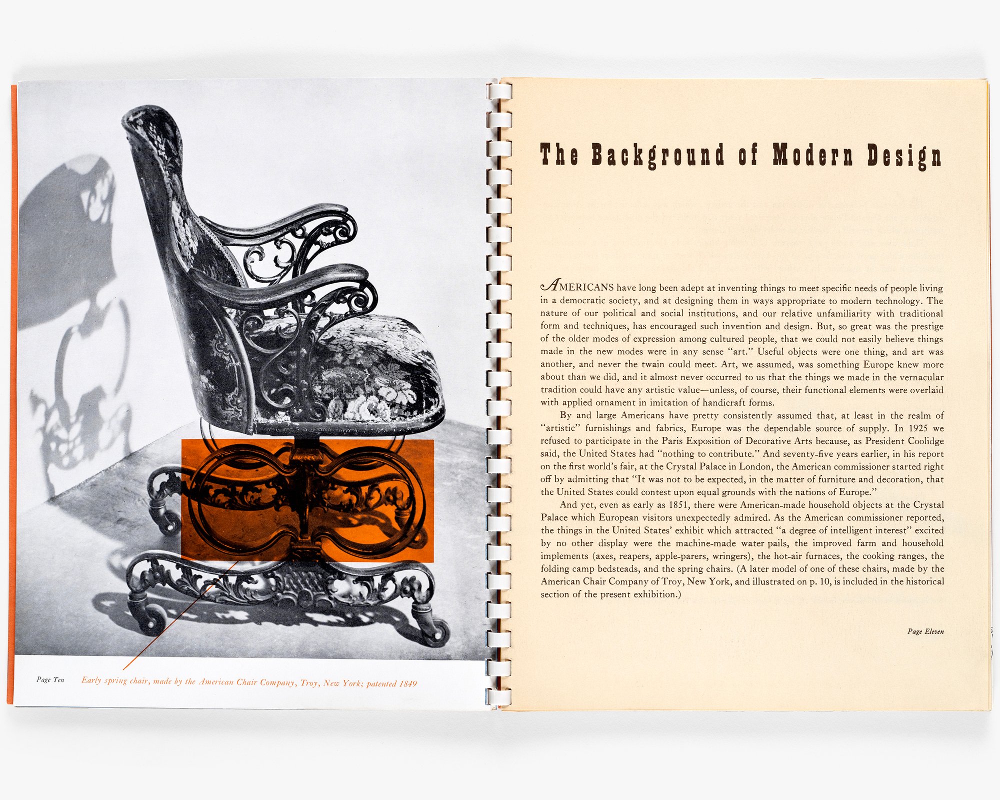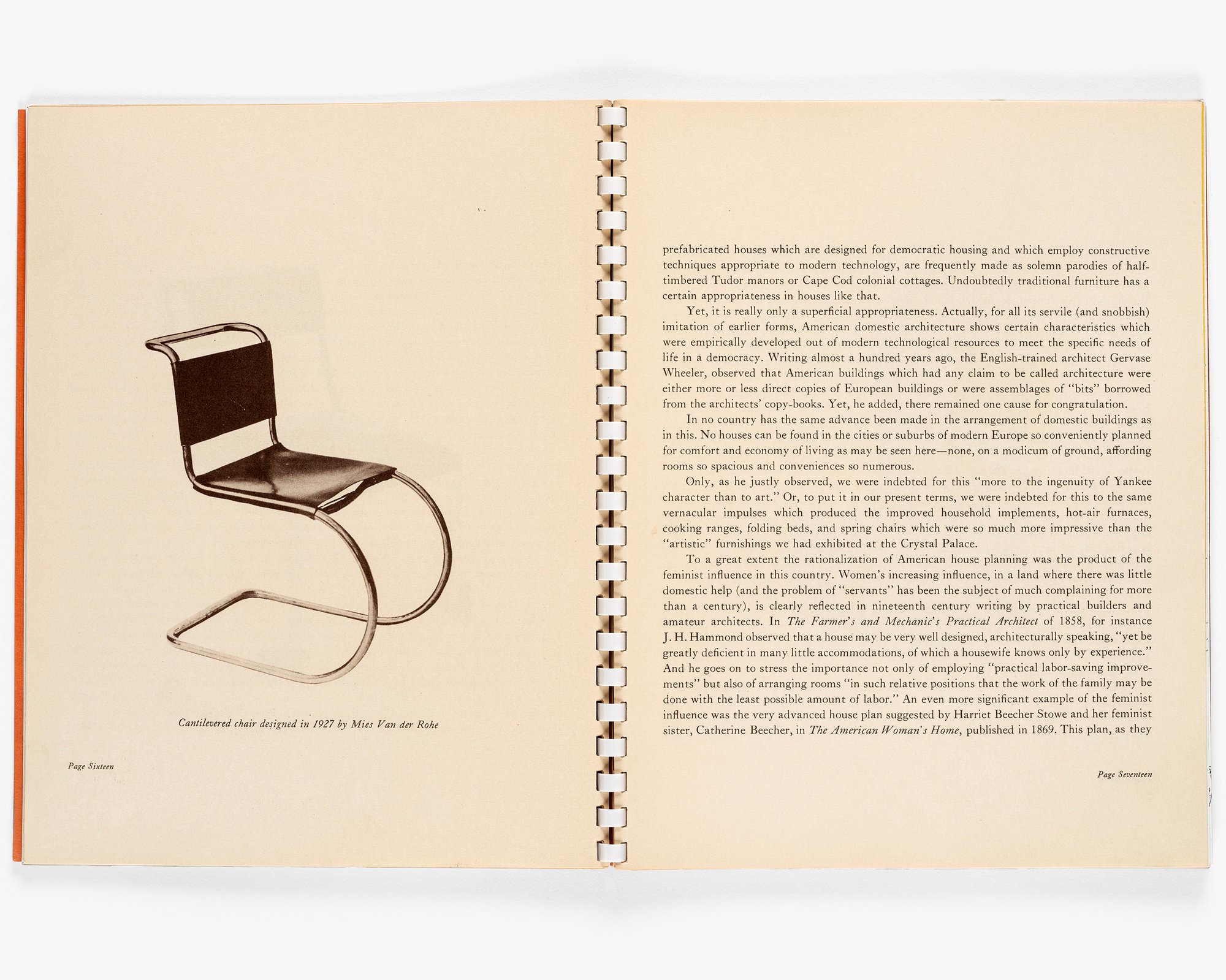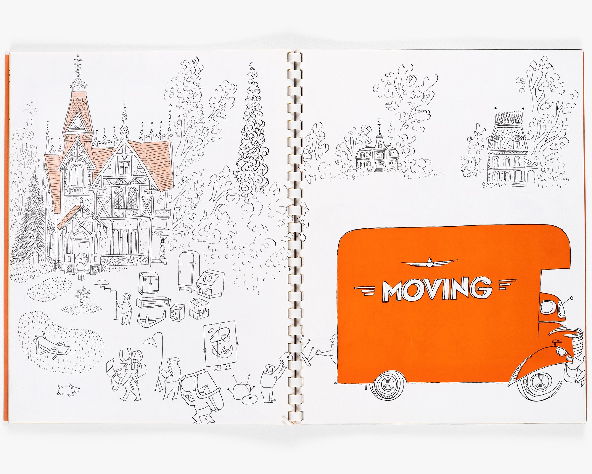 Saul Steinberg likely first crossed paths with the Eameses when they participated in An Exhibition for Modern Living at the Detroit Institute of Arts, a showcase of modern design that was organized by the Eameses’ close friend Alexander Girard in 1949. The exhibition included a “Hall of Objects” displaying various housewares as well as seven rooms by leading designers, including George Nelson, Eero Saarinen, and the Eameses. The Eames room featured their molded plywood chairs arranged around a folding table, a prototype of the La Chaise lounge chair, and multiple Eames Storage Units—all enlivened by bouquets of flowers, paper kites, and a light fixture dubbed the Galaxy Light that resembled both a model of an atom and a starburst. Steinberg’s distinct contribution to the show was a series of drawings photographically enlarged into a mural that depicted the panoply of design in modern life through his unique artistic lens. The exhibition was extensively documented in this catalog, which includes numerous examples of Eames furniture and drawings by Steinberg, many of which speak to the evolving tension between traditional and modern styles. The drawing that appears on the catalog’s cover illustrates this relationship by depicting a man engrossed in a newspaper. He sits on a simple modern side chair while the ornate armchair before him is reduced to a footrest, making a clear statement of preference for modern styles over traditional ones.