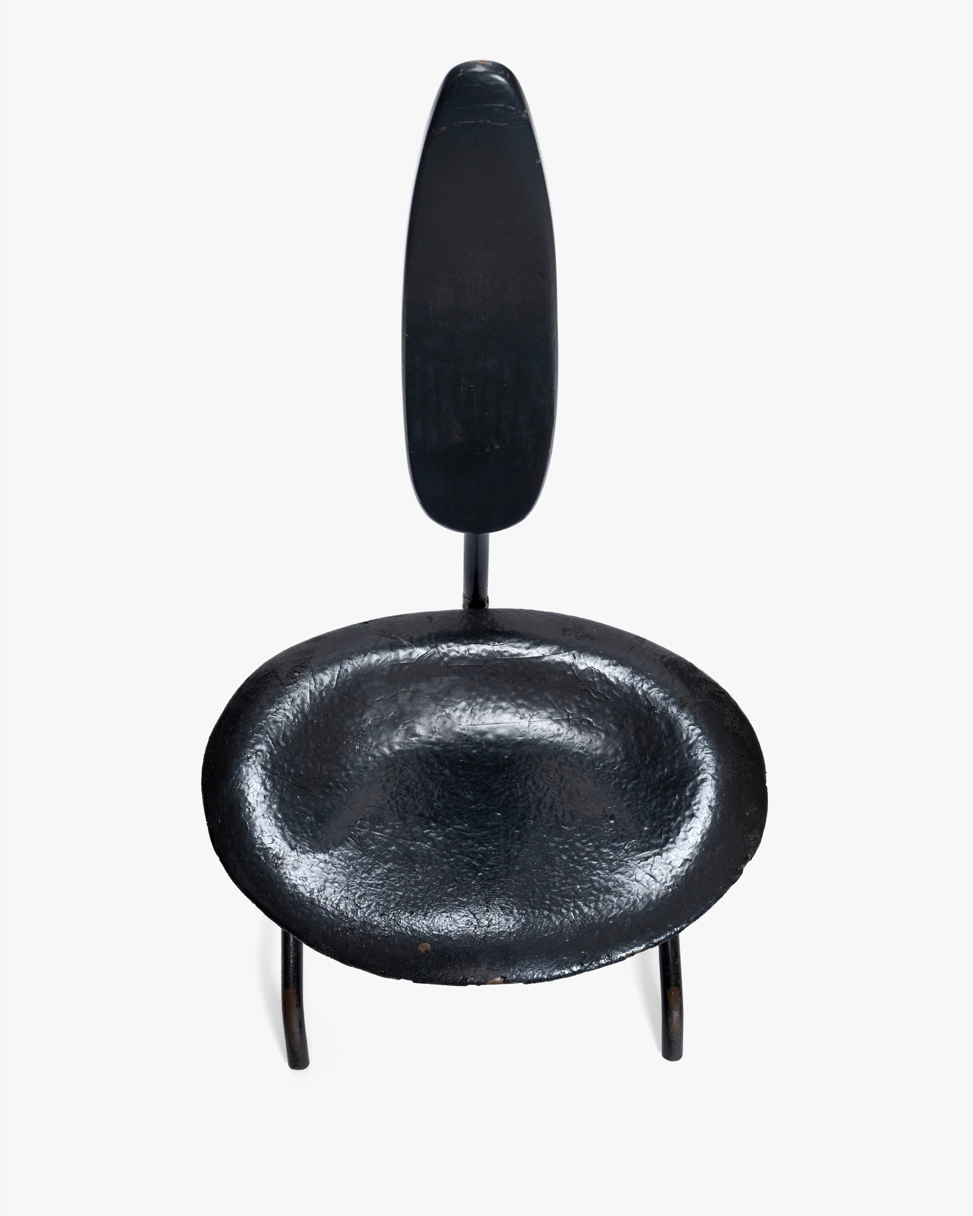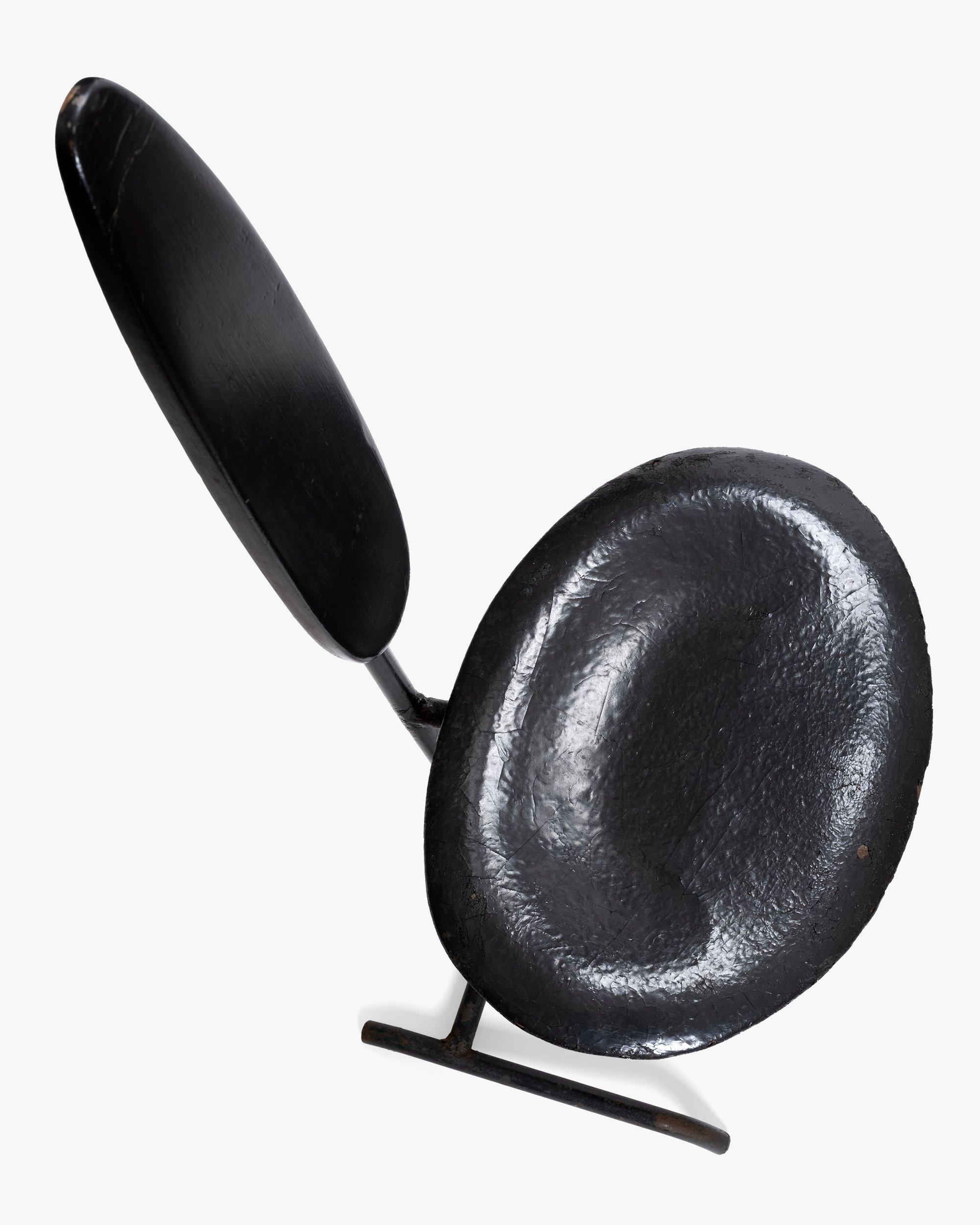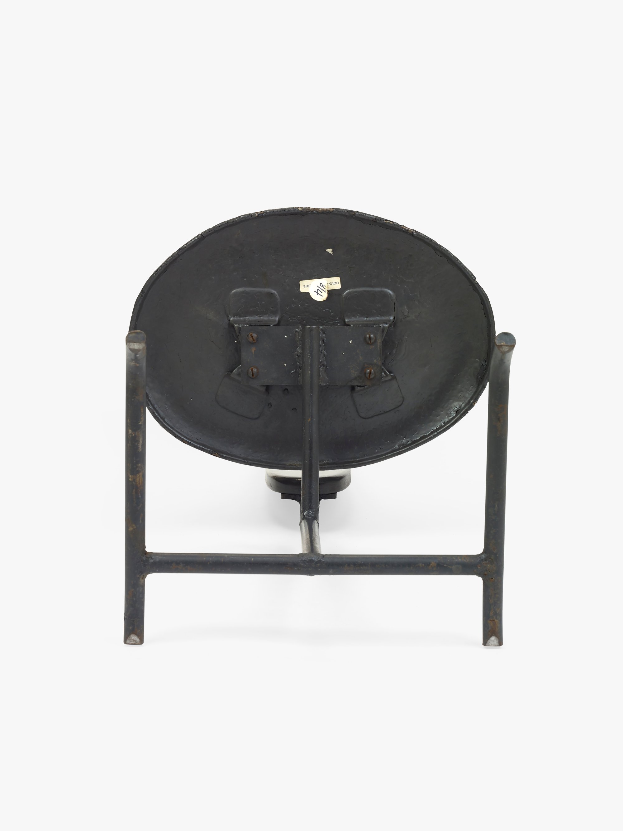 This chair, along with the La Chaise lounge chair and several stamped metal chairs, was part of the Eameses’ prize-winning entry to the International Competition for Low-Cost Furniture Design Competition held by the Museum of Modern Art in 1948. The competition was motivated by the need for affordable furniture in the postwar period, a result of lingering materials shortages paired with high demand for housing and furnishings. One common approach to lowering costs was cutting down on materials, and the Minimum Chair pushed this tactic to the extreme by testing just how little was needed to provide a comfortable seat. The result was this slender design made of two ovular pieces of sheet metal and a metal rod base (another version was made with perforated metal) that weighed only 13 pounds. Though the Minimum Chair was never put into production, this prototype remained at the Eames Office and later appeared in a 1950 photograph of Charles posing with a La Chaise on which Saul Steinberg had drawn a reclining nude woman.