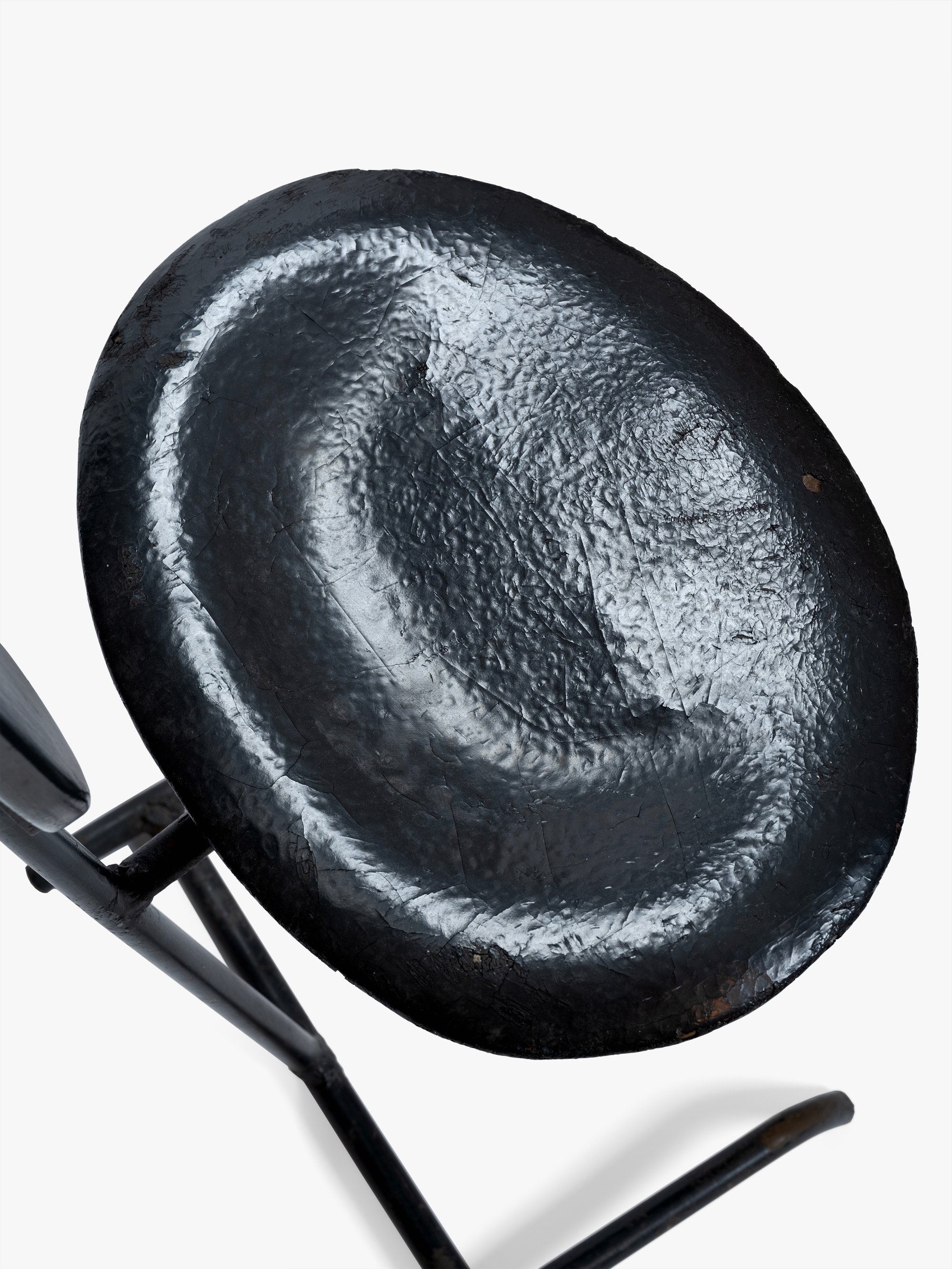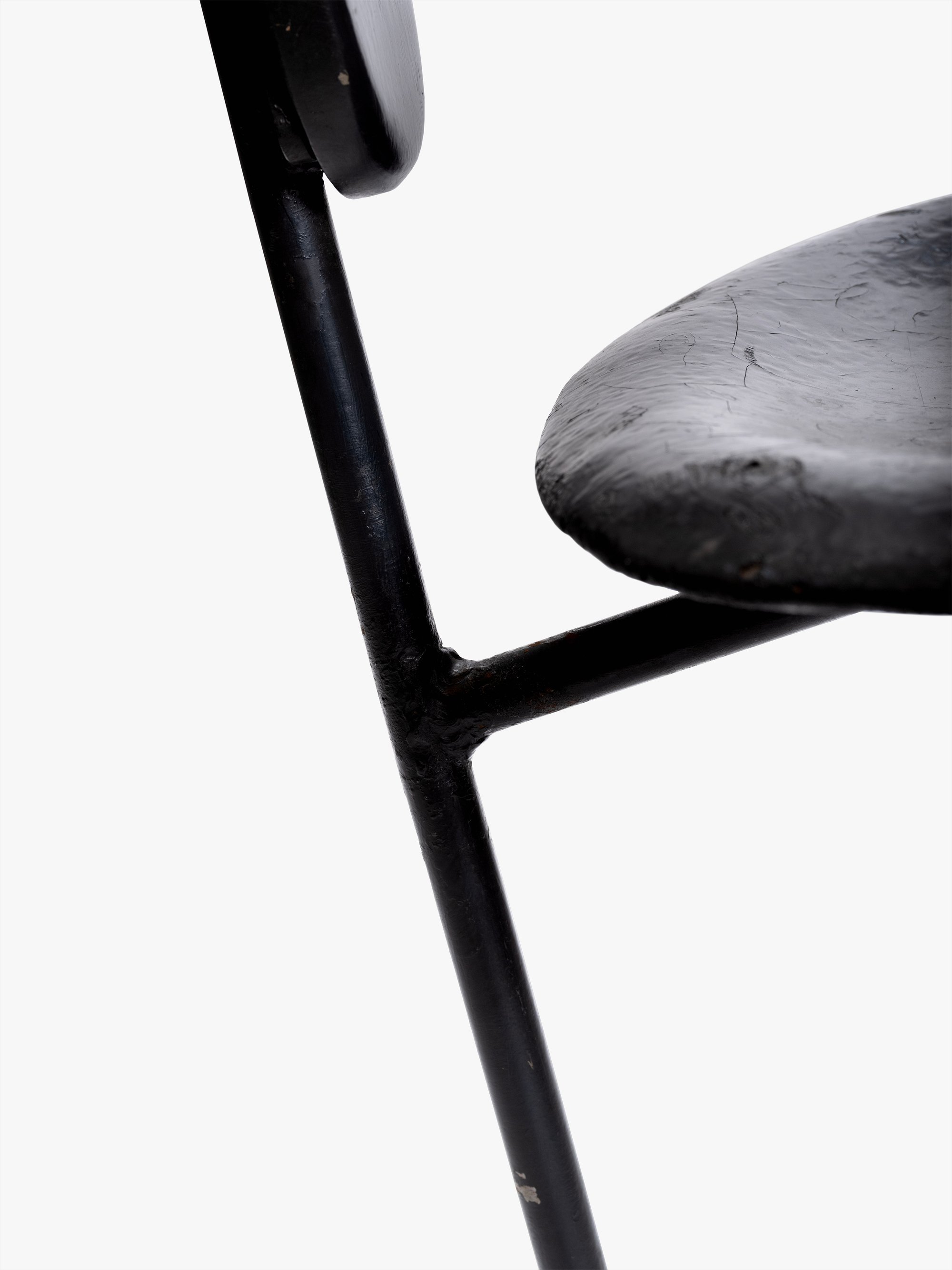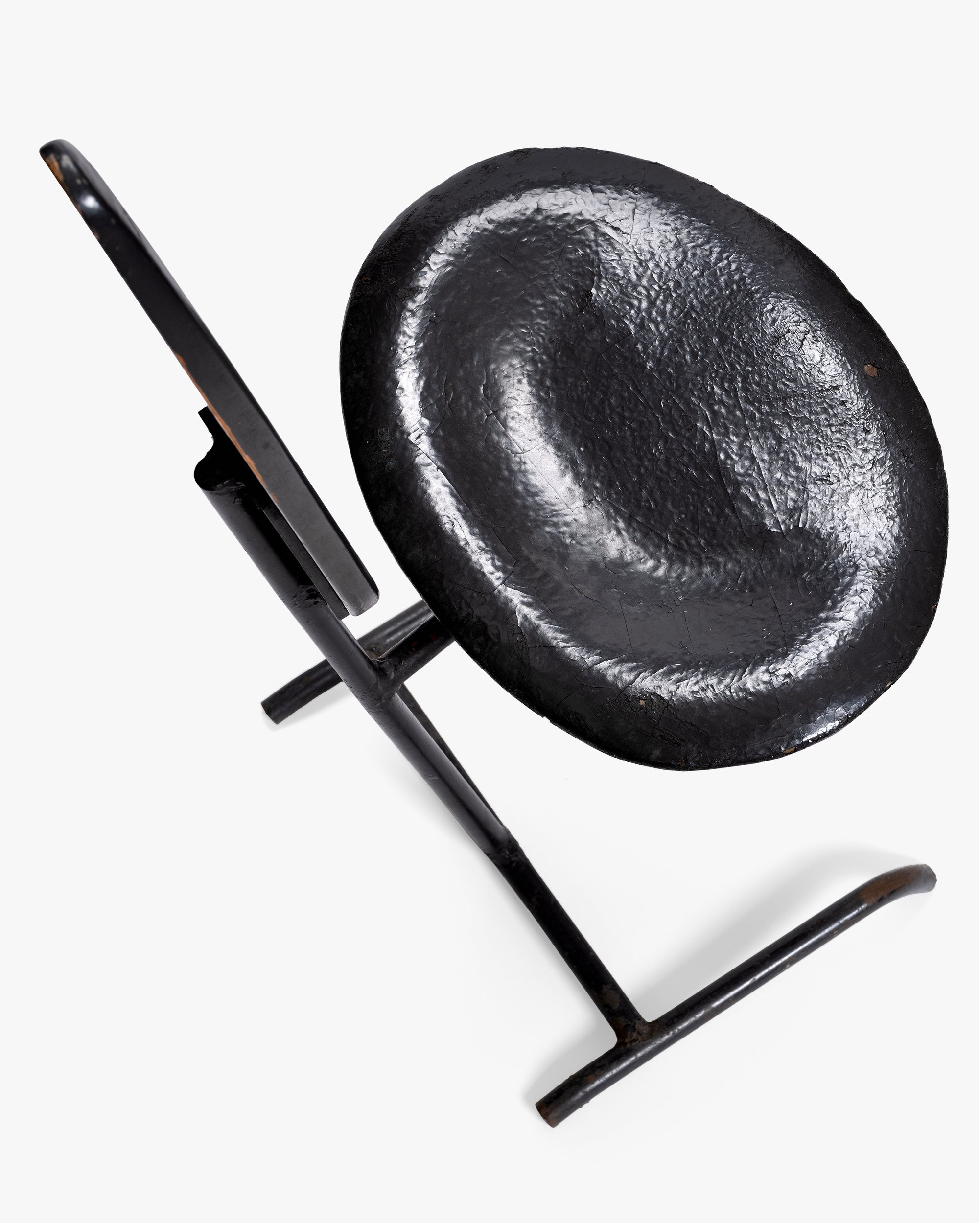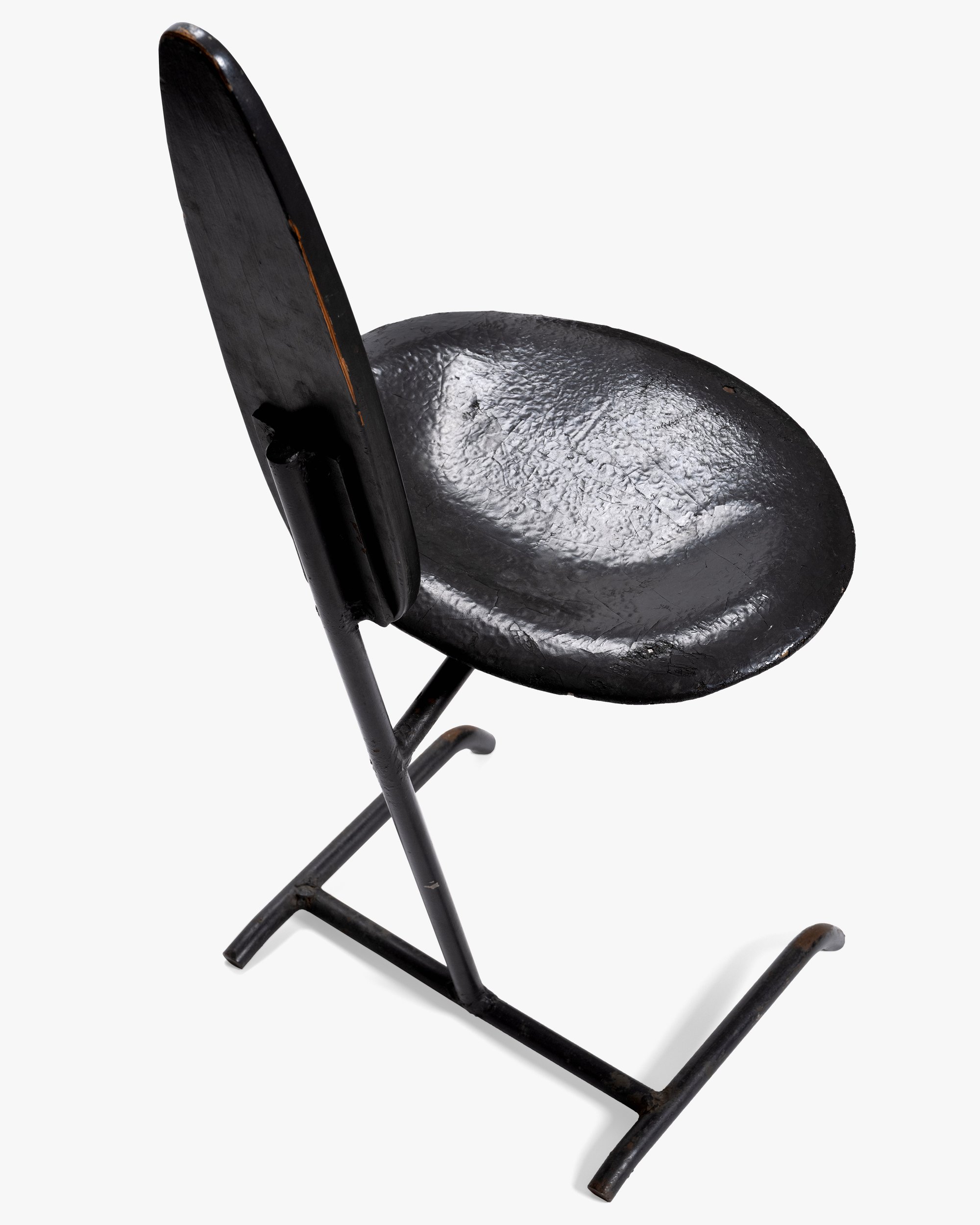 This chair, along with the La Chaise lounge chair and several stamped metal chairs, was part of the Eameses’ prize-winning entry to the International Competition for Low-Cost Furniture Design Competition held by the Museum of Modern Art in 1948. The competition was motivated by the need for affordable furniture in the postwar period, a result of lingering materials shortages paired with high demand for housing and furnishings. One common approach to lowering costs was cutting down on materials, and the Minimum Chair pushed this tactic to the extreme by testing just how little was needed to provide a comfortable seat. The result was this slender design made of two ovular pieces of sheet metal and a metal rod base (another version was made with perforated metal) that weighed only 13 pounds. Though the Minimum Chair was never put into production, this prototype remained at the Eames Office and later appeared in a 1950 photograph of Charles posing with a La Chaise on which Saul Steinberg had drawn a reclining nude woman.