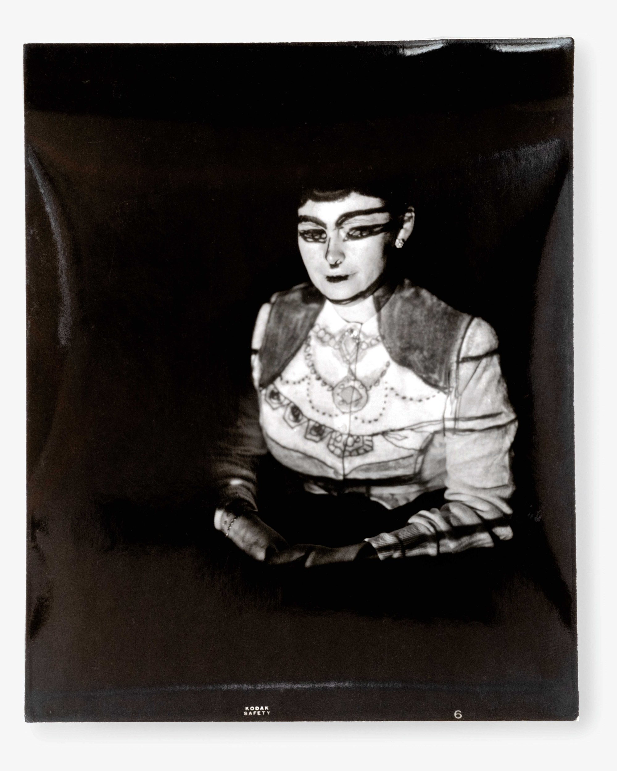 This photograph is one of a series in which a Saul Steinberg drawing of a woman was projected onto Hedda Sterne. Here, the projection aligns so closely with Sterne’s own features that it becomes a mask of sorts. This anticipates the paper-bag masks that Steinberg would begin making several years later. Between 1959 and 1962, he animated many simple paper bags with faces drawn in crayon, ink, or pencil, which he and his friends then donned for masked portraits taken by photographer Inge Morath. The Eameses shared Steinbergs' interest in masks. They began collecting masks from around the world in the 1940s and in 1950 they designed a range of oversized animal masks for children and adults, which subsequently made appearances as props and decorations in photo shoots, exhibitions, and staged rooms.