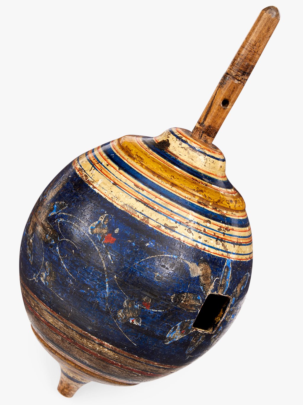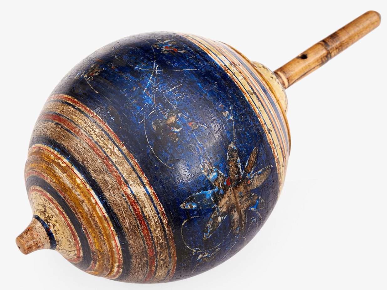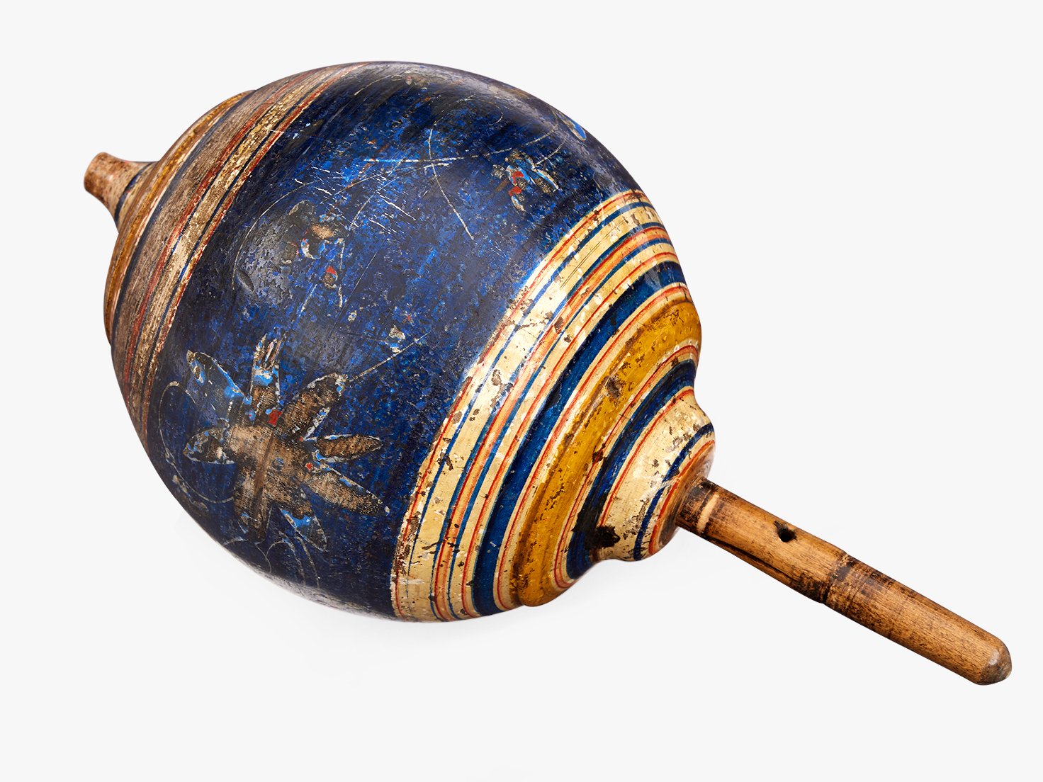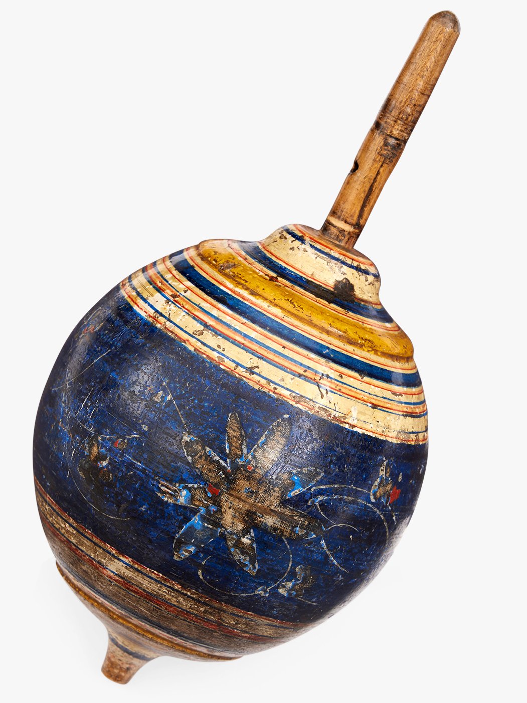 The Eameses’ top collection was put on magnificent display in their short film Tops, which was released in 1969. The 7 ½-minute film features a grand total of 123 tops that spin, skid, and eventually topple across the screen. The action unfolds against a composed score by Elmer Bernstein, whose music is carefully calibrated to create excitement as well as palpable shifts in tone without the help of any narration. Much of the film uses close-up shots to create dizzying frames of the twirling toys, but it also includes wider views of children winding and releasing them. The cast was made up of children and adults representing a wide range of races and ethnicities, emphasizing the Eameses’ interest in the worldwide popularity of this simple toy. When this large wooden top appears in the film, it spins on a parquet floor in front of the trappings of an English parlor, including ornate wallpaper, a potted plant, and a carved wooden chair—this setting cleverly clues in viewers to the top’s English origin.