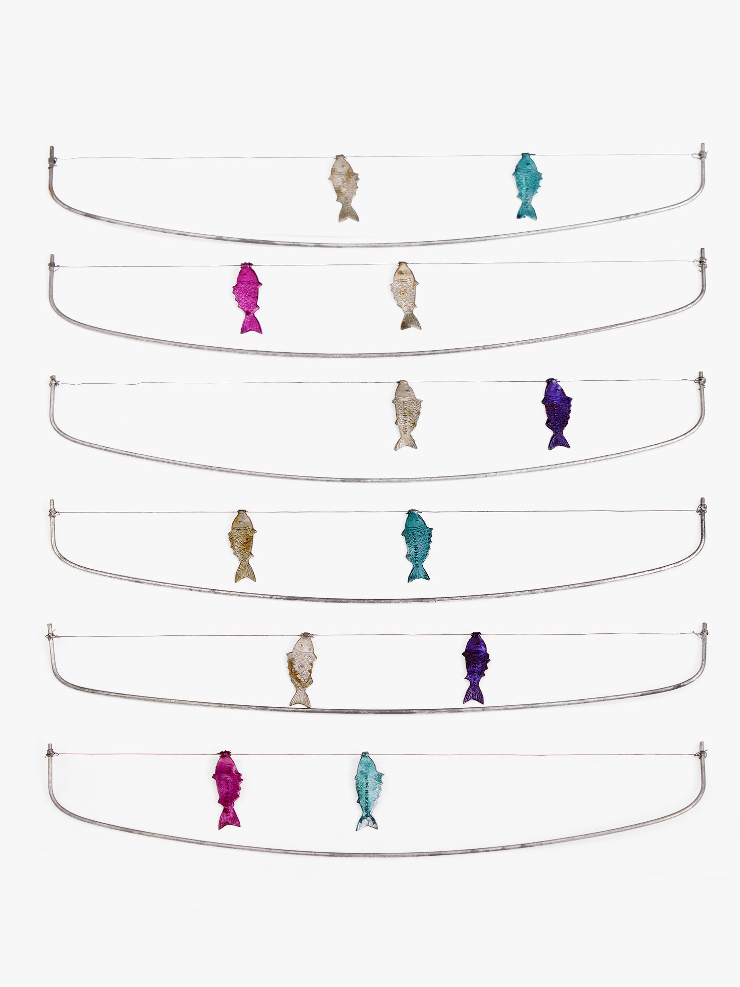 These toys from Japan create the illusion of fish wriggling down a string by use of a curved metal frame that holds a thin wire taut, relying on gravity to slide the fish down the wire. The simple toy makes clever use of its materials’ tensile properties, something that undoubtedly appealed to the Eameses, who experimented intensively with properties of plastics, metals, textiles, and other materials in their own work. They were also likely drawn to its whimsy, a quality they highlighted when they photographed it for their House of Cards construction toy that was introduced in 1952. The House of Cards was inspired by the precarious structures built with conventional card decks, but it offered cards that could create far sturdier structures thanks to six slots arranged around their edges that allowed the cards to be firmly slotted together. House of Cards constructions were also more colorful than typical card towers, thanks to the dozens of different images and patterns that decorated them. The Japanese fish toys appear on a card against a bright red background, layered on top of one another in a way that creates a single cluster of fish. The toys’ wire and metal frames are visible but cropped, making it difficult to picture the individual toys and heightening the illusion of a colorful school of floating fish.