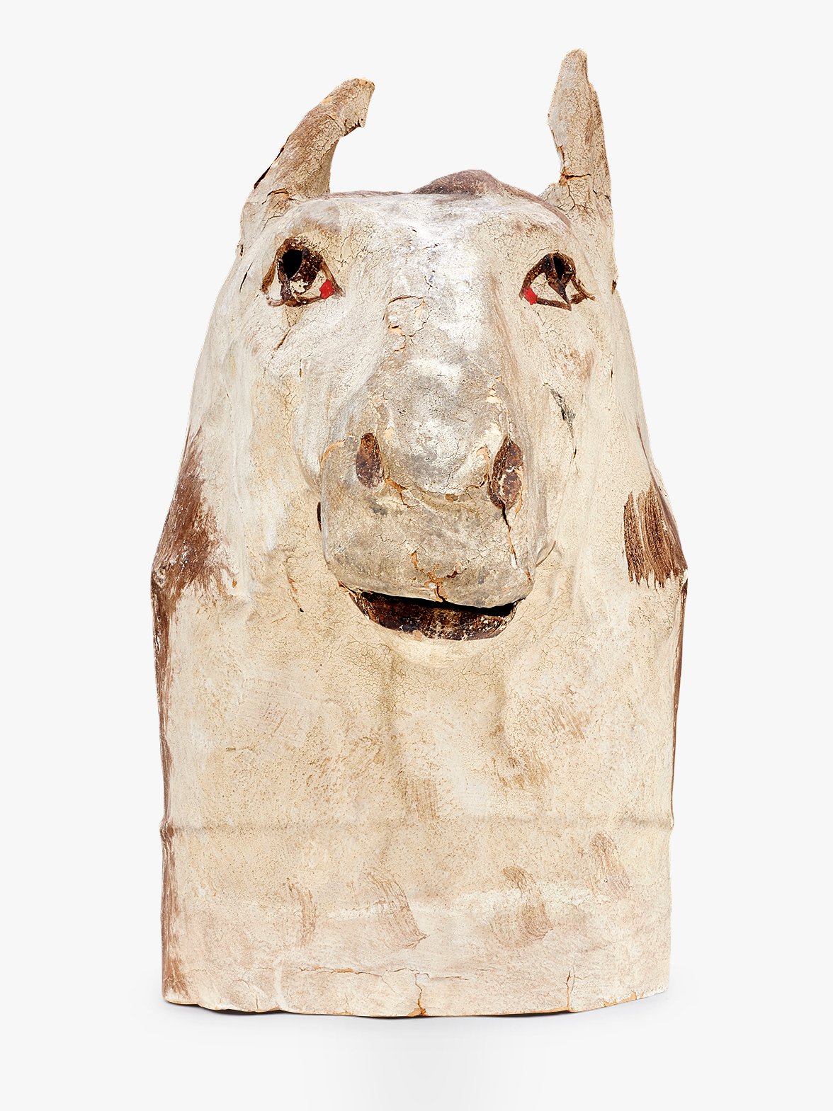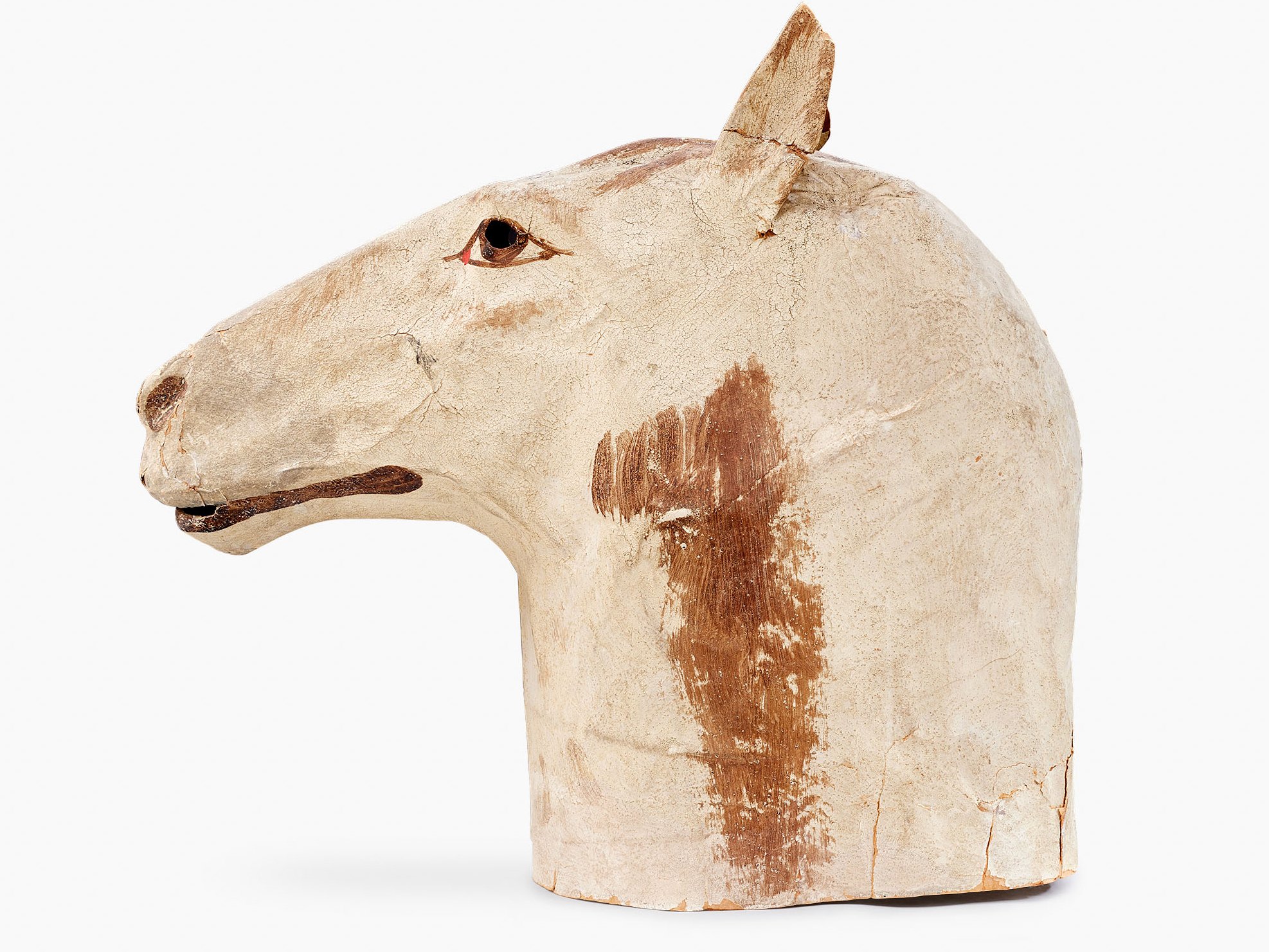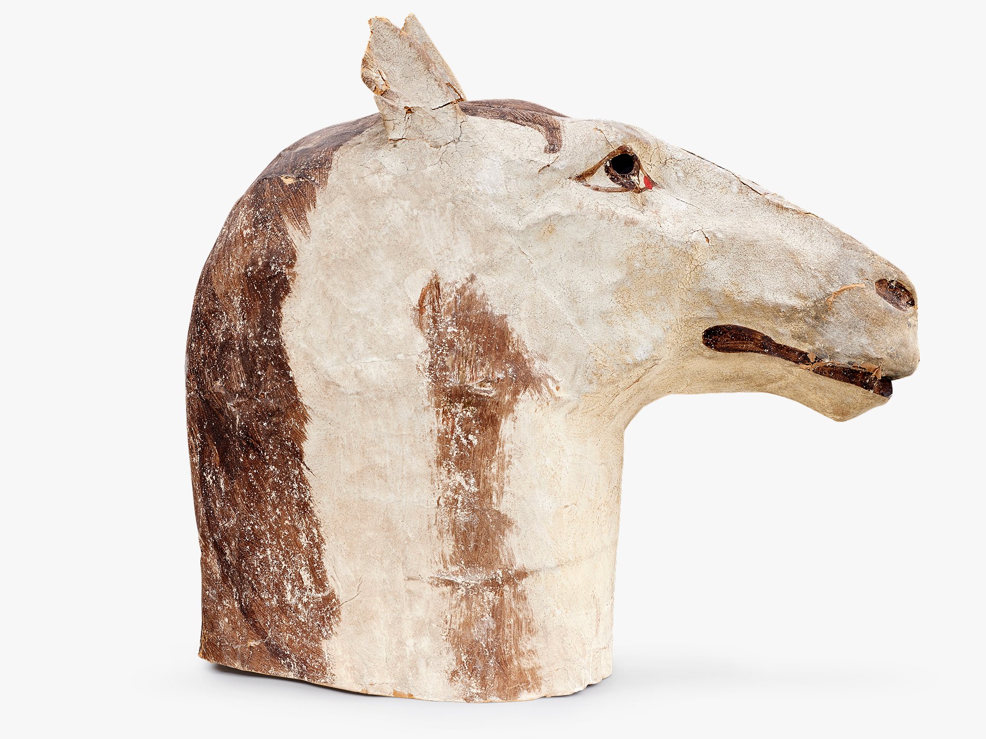 Found in cultures around the world, masks are used for endeavors both silly and serious—from lighthearted dress-up to religious ceremonies. This horse head is an example of the papier mâché masks that were worn in Czechoslovakia as part of Masopust celebrations (an equivalent of Mardi Gras). Once it found its way into the Eameses’ collection, however, the mask took on a new significance and became a favorite playful prop in their home. At some point in the 1950s, Charles donned the mask to pose for photos with Ray (who wore a similar black horse head) in front of a curtain backdrop. Although their faces are hidden, both are recognizable thanks to their signature clothing styles: a suit for Charles and a full-skirted dress with collar for Ray. These horse heads along with the other masks that they made and collected served as tools for imaginative role-playing and storytelling, even when it was obvious who was behind the disguise.