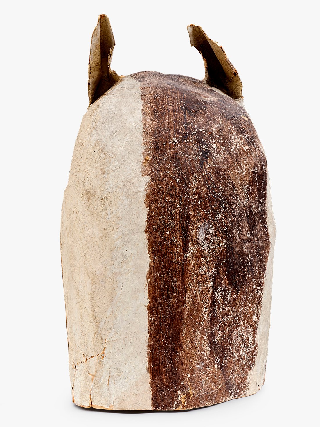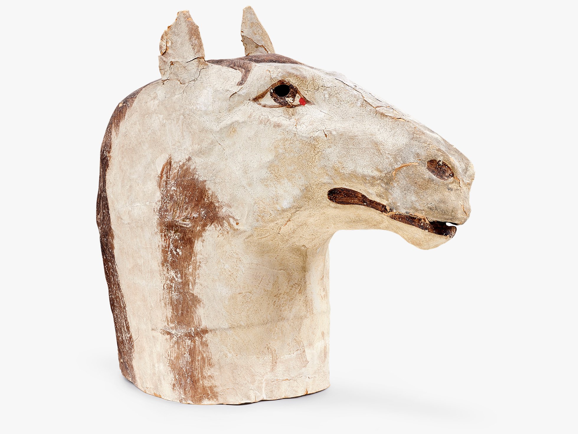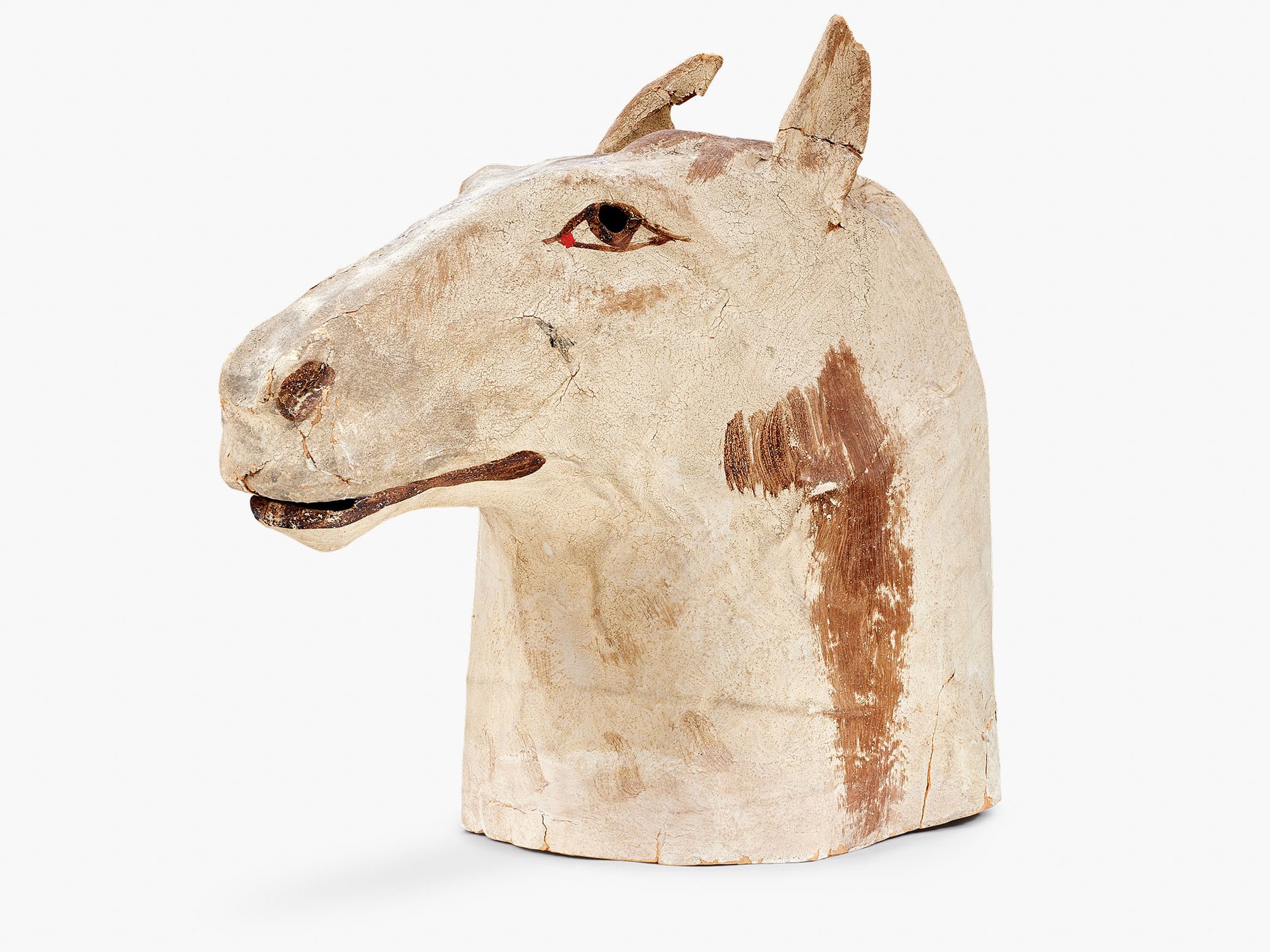 Found in cultures around the world, masks are used for endeavors both silly and serious—from lighthearted dress-up to religious ceremonies. This horse head is an example of the papier mâché masks that were worn in Czechoslovakia as part of Masopust celebrations (an equivalent of Mardi Gras). Once it found its way into the Eameses’ collection, however, the mask took on a new significance and became a favorite playful prop in their home. At some point in the 1950s, Charles donned the mask to pose for photos with Ray (who wore a similar black horse head) in front of a curtain backdrop. Although their faces are hidden, both are recognizable thanks to their signature clothing styles: a suit for Charles and a full-skirted dress with collar for Ray. These horse heads along with the other masks that they made and collected served as tools for imaginative role-playing and storytelling, even when it was obvious who was behind the disguise.