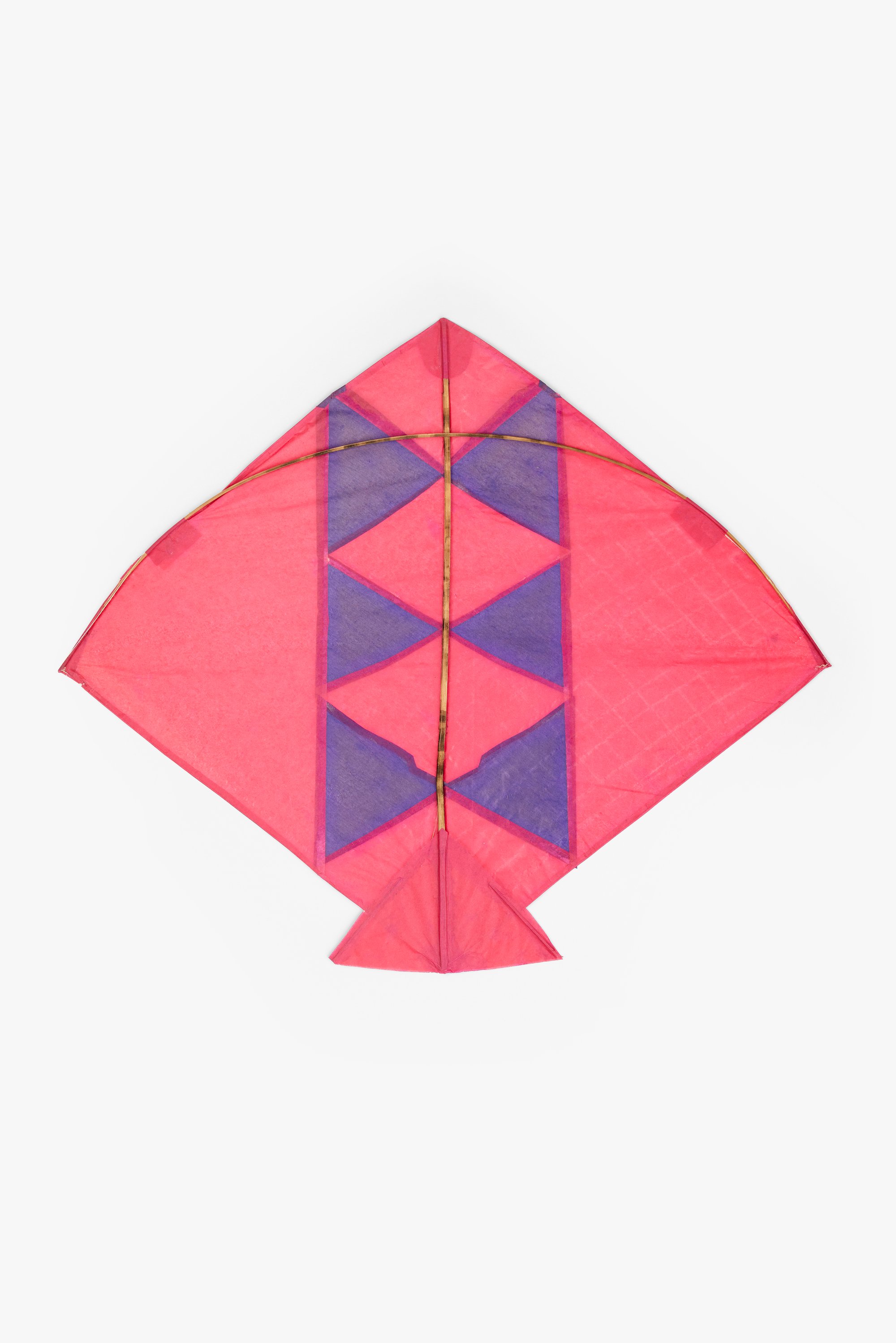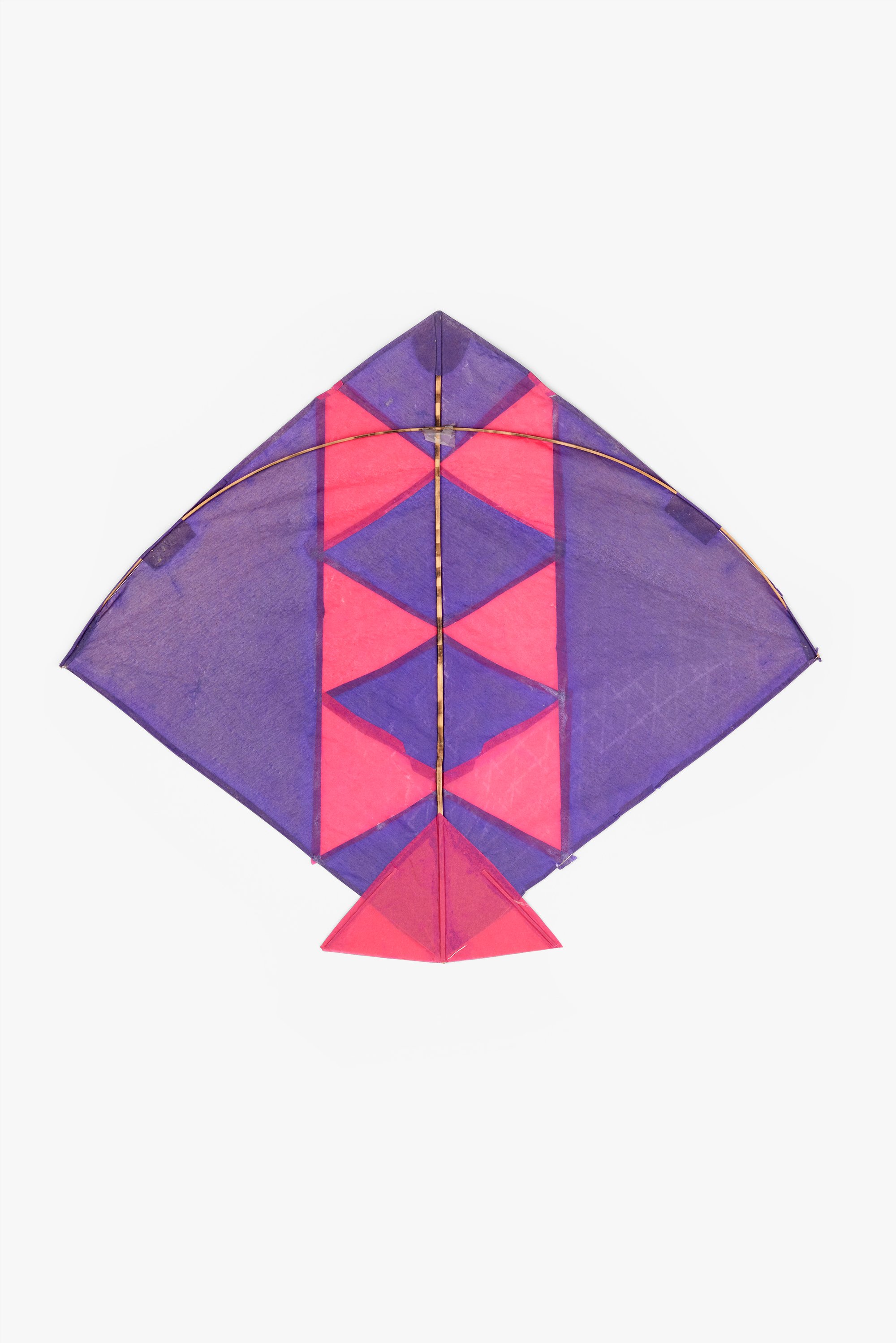 Among the more than three dozen Indian paper kites, or patang, in the Eameses’ collection, many of the same patterns repeat in different colorways. In this case, one kite features a pattern of purple triangles on a red background and the other features the same pattern in red on a purple background. Comparing the two makes for a compelling lesson in color theory, with the triangles appearing to pop out or recede depending on the color combination. Similarly, the vertical arrangement of forms may be perceived as a stack of bow ties in one moment, and a column of diamonds and triangles in the next. These aspects of the design would have been of interest to the Eameses, who were particularly skilled in matters of color and form. Moreover, the technique of cutting-and-pasting paper that produced these kites was a method Ray used often in preparing mock-ups for packaging and advertisements, and she no doubt delighted in seeing these methods used by other makers halfway across the world.