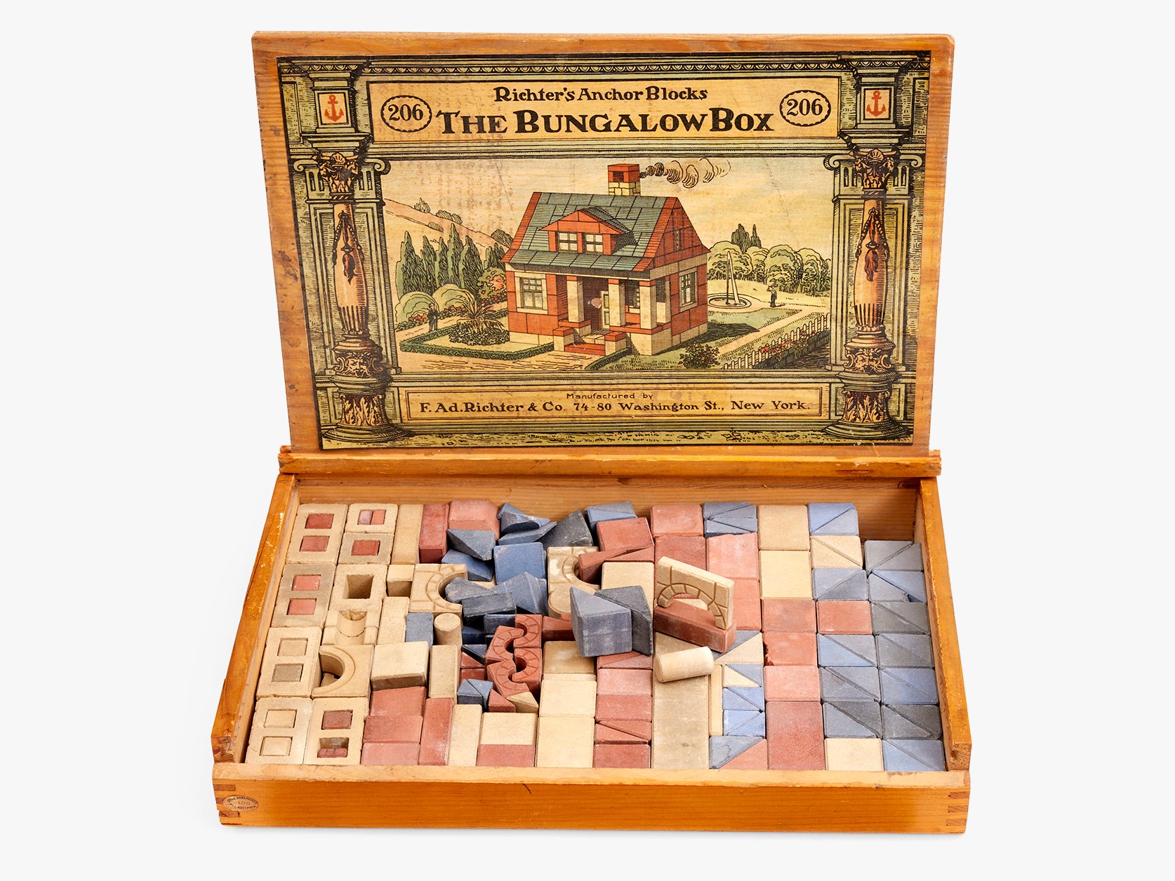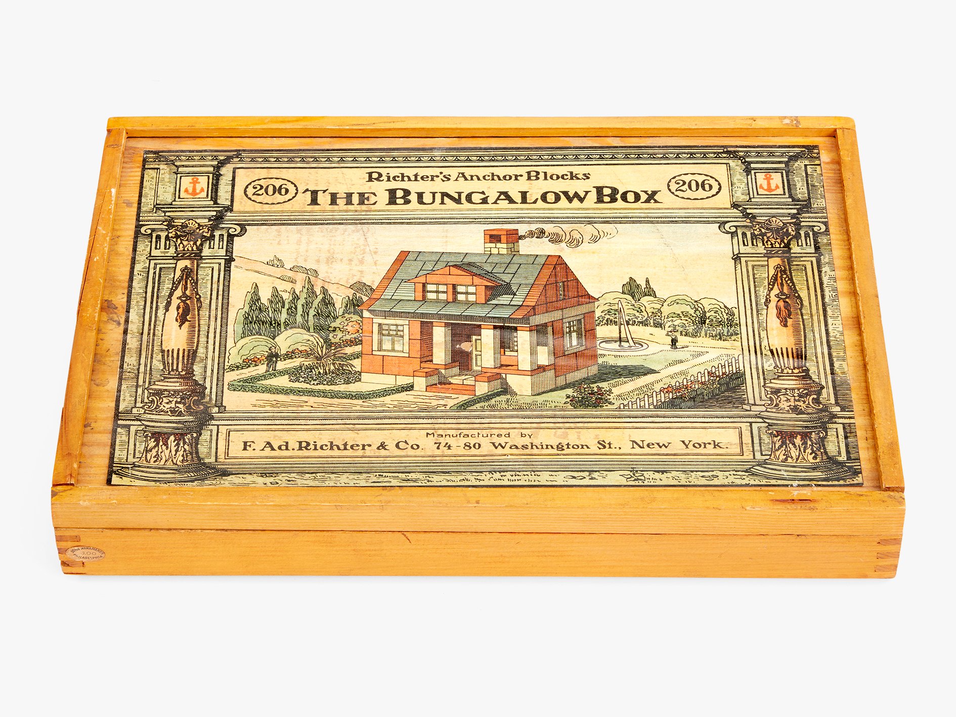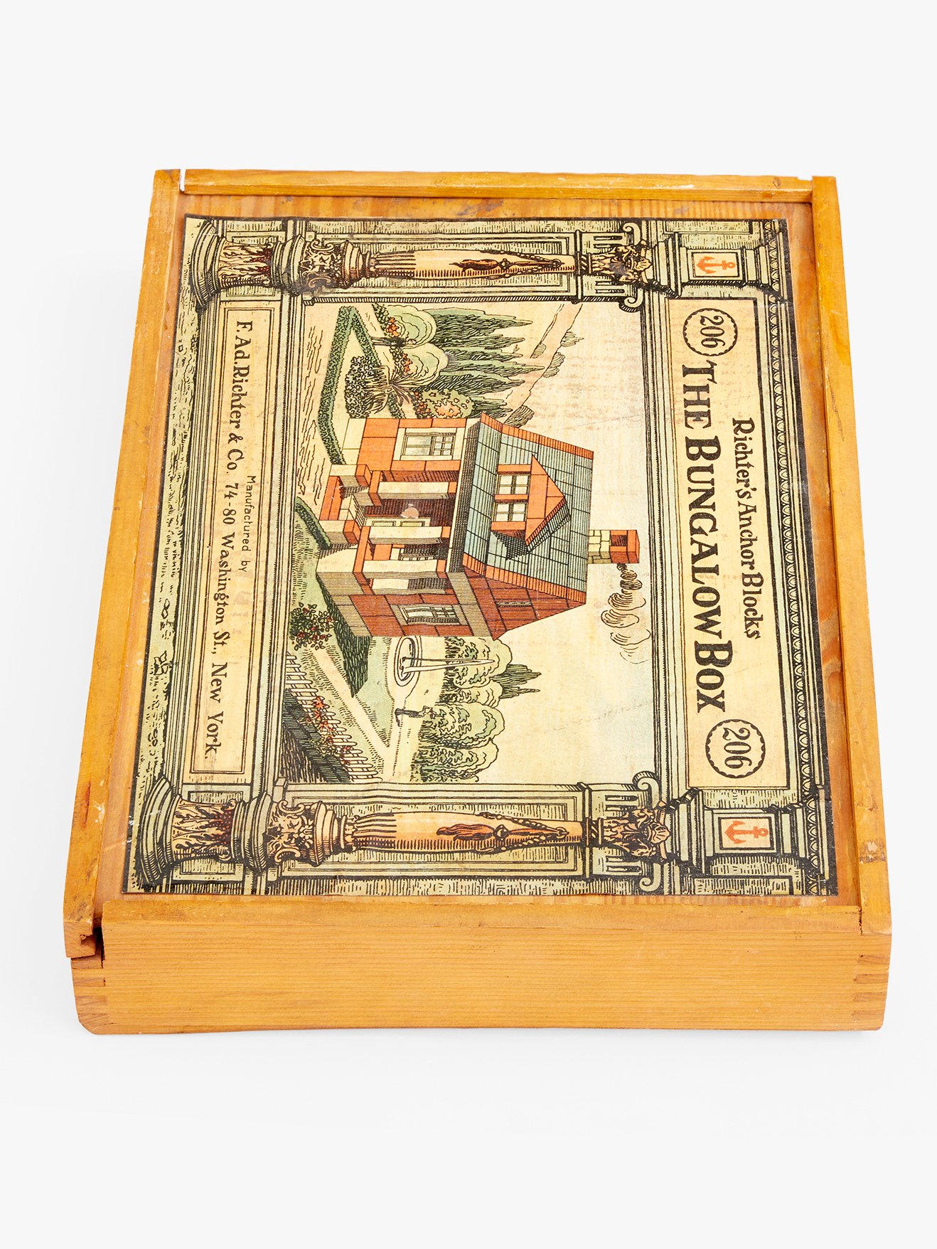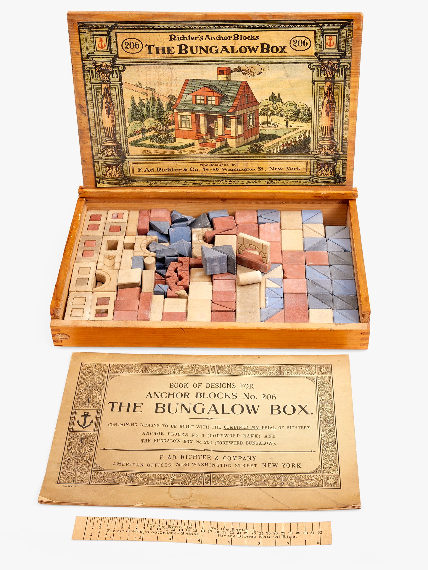 This type of stone construction kit was first produced in Germany in the mid-19th century and became popular in the 1880s when businessman Friedrich Adolf Richter acquired the rights to the design and began marketing them under his name. Richter’s business benefited from the long-lasting effects of 19th-century education reform that encouraged hands-on learning with blocks and other simple toys. Richter’s company produced hundreds of different kits, including this Bungalow Box that was designed around 1910 and reflected the growing popularity of Bungalow-style houses—a type of small, free-standing domestic architecture that had originated in Bengal—in Europe and the US, where they became associated with the Arts and Crafts movement in architecture and design. In 1966, the Eameses assembled and photographed a set of Richter’s Anchor Blocks for an advertisement for Herman Miller’s New York showroom. The tri-fold ad, which ran in two major architectural magazines, filled three pages with a block construction that evoked the elaborate stone masonry of a medieval cathedral. The Eameses playfully augmented the construction by incorporating small images of modern interiors and their own chair designs, and by including the Herman Miller logo in place of a stained glass rose window.
