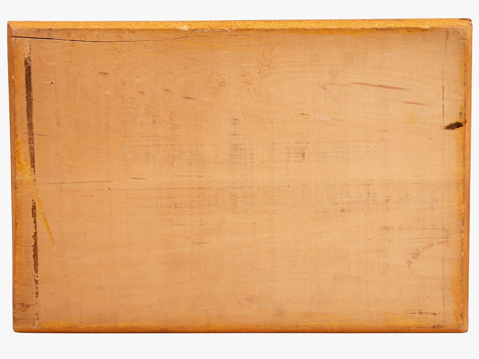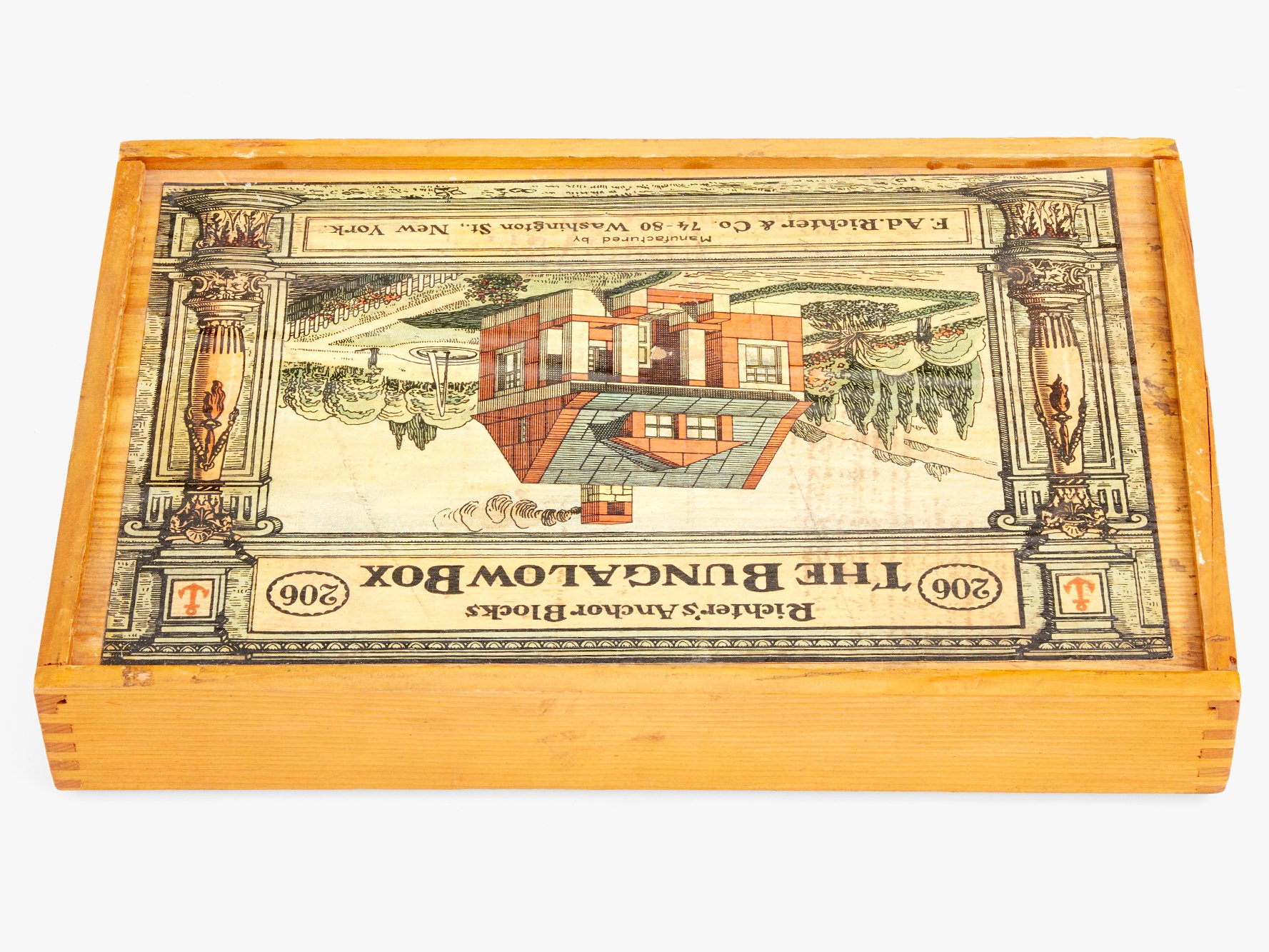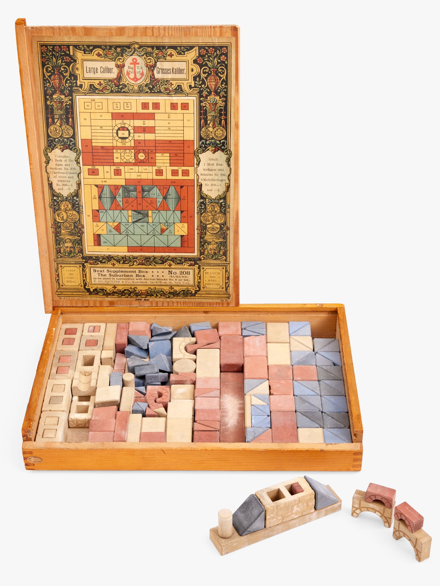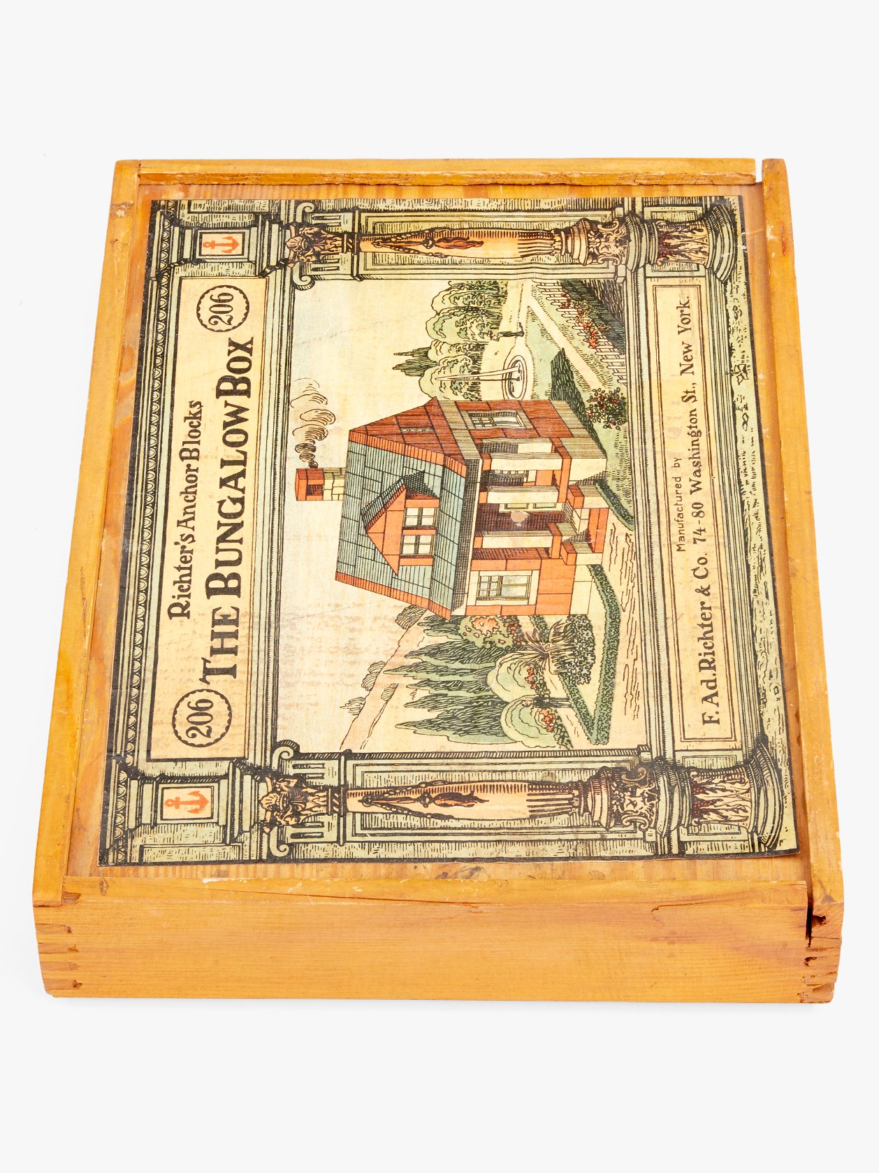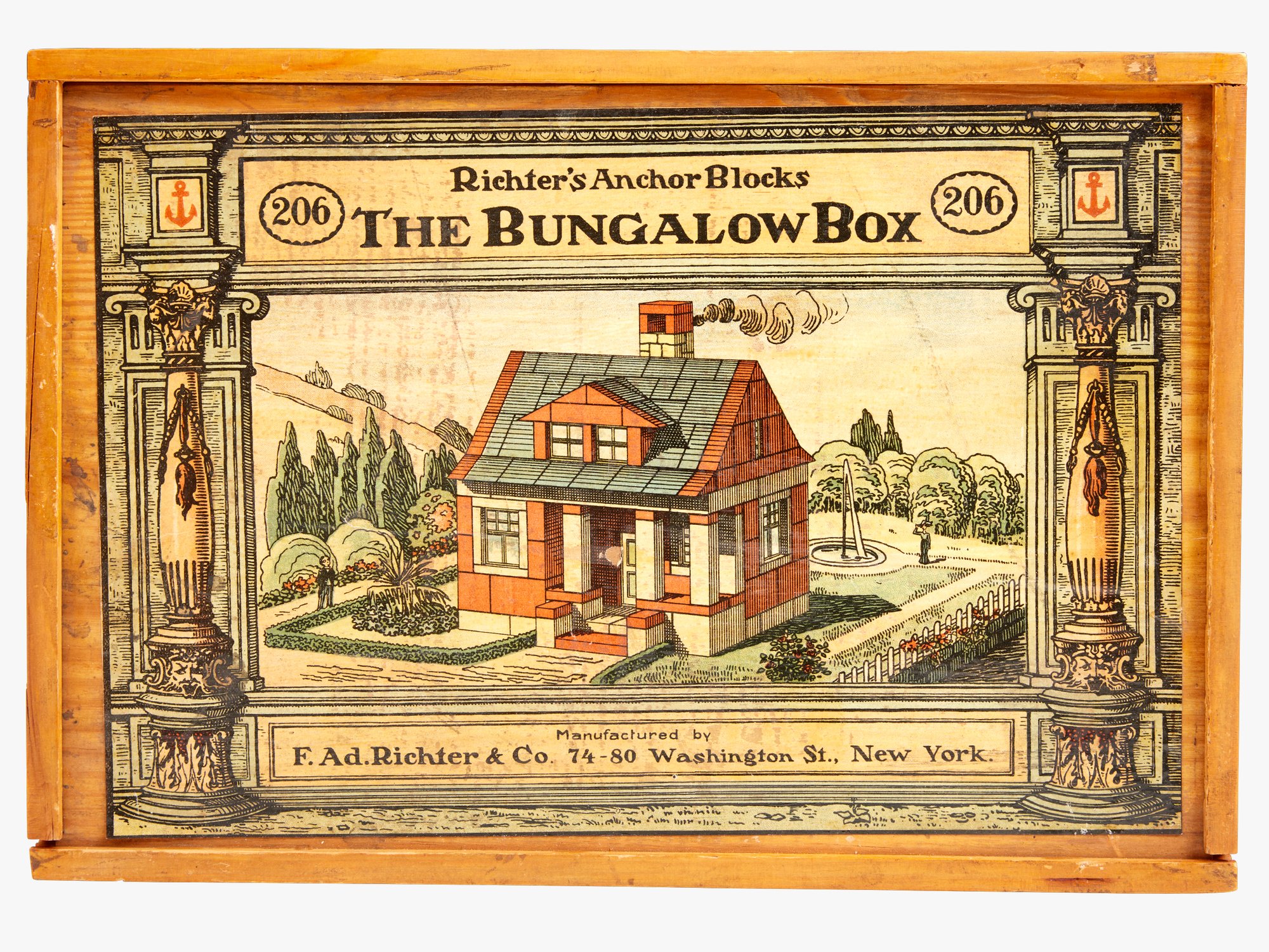This type of stone construction kit was first produced in Germany in the mid-19th century and became popular in the 1880s when businessman Friedrich Adolf Richter acquired the rights to the design and began marketing them under his name. Richter’s business benefited from the long-lasting effects of 19th-century education reform that encouraged hands-on learning with blocks and other simple toys. Richter’s company produced hundreds of different kits, including this Bungalow Box that was designed around 1910 and reflected the growing popularity of Bungalow-style houses—a type of small, free-standing domestic architecture that had originated in Bengal—in Europe and the US, where they became associated with the Arts and Crafts movement in architecture and design. In 1966, the Eameses assembled and photographed a set of Richter’s Anchor Blocks for an advertisement for Herman Miller’s New York showroom. The tri-fold ad, which ran in two major architectural magazines, filled three pages with a block construction that evoked the elaborate stone masonry of a medieval cathedral. The Eameses playfully augmented the construction by incorporating small images of modern interiors and their own chair designs, and by including the Herman Miller logo in place of a stained glass rose window.