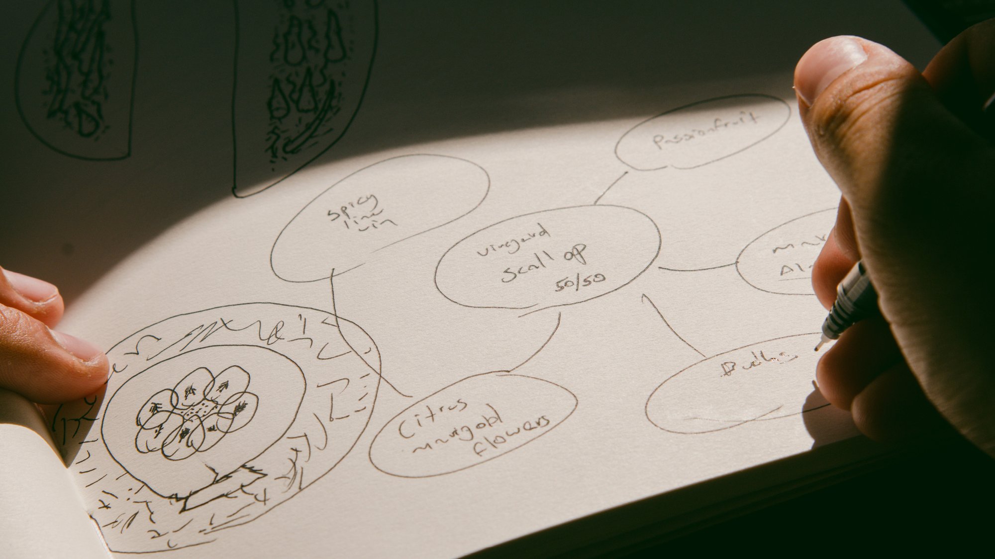 Moving from palette to plate, Florez first draws the meal aesthetics and ingredients, then brings them to three-dimensional life with his team.